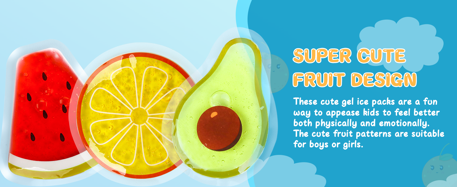- 🍊【BYE BYE BOO BOOS】Cute Fruit Patterns: Kids ice packs are perfect for the little bumps and kids' boo-boos. With cute fruit patterns of avocado, orange, and watermelon, these ice packs provide comfort & distraction to help your boys or girls forget about their injuries, fever, nose bleeds, toothache, allergies, and more. The cute fruit reusable gel ice packs for injuries are suitable for boys or girls