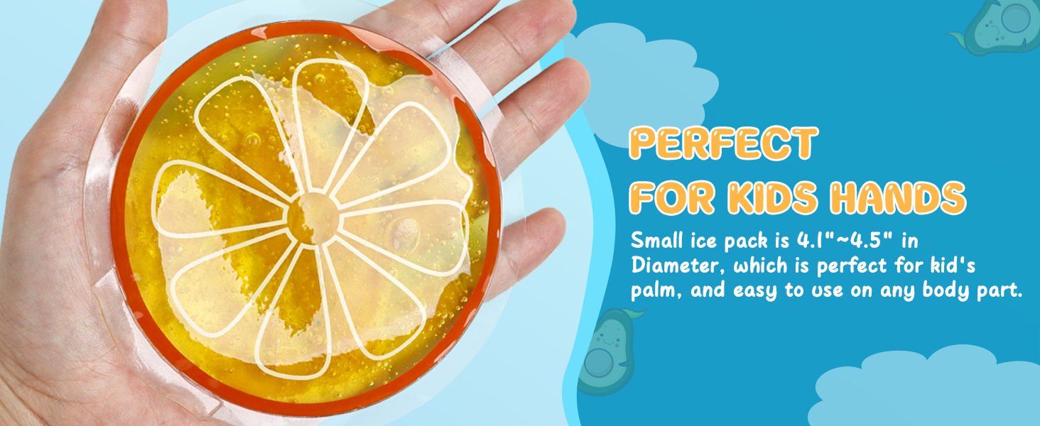- 🍊【ORANGE IS THE COLOR OF THE SUN】Perfect Size for Kids: Each gel pack is 4.1"-4.5" In diameter. This compact size is perfect for the palm of kids and toddlers, not too big, and is easily used on any body part, like forehead, arm, knee, neck, shoulder, and even joints and hard-to-reach places. These small gel ice packs can be stored in the refrigerator and used as daily first aid cold packs.