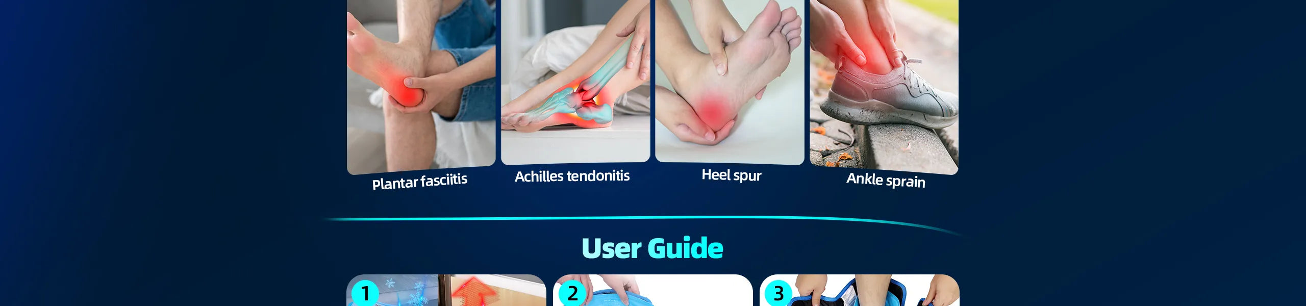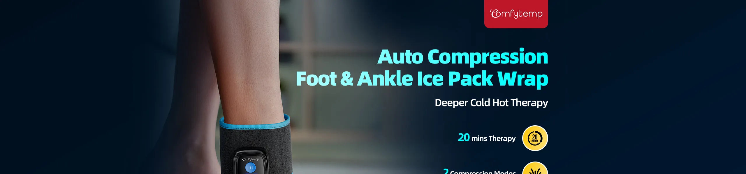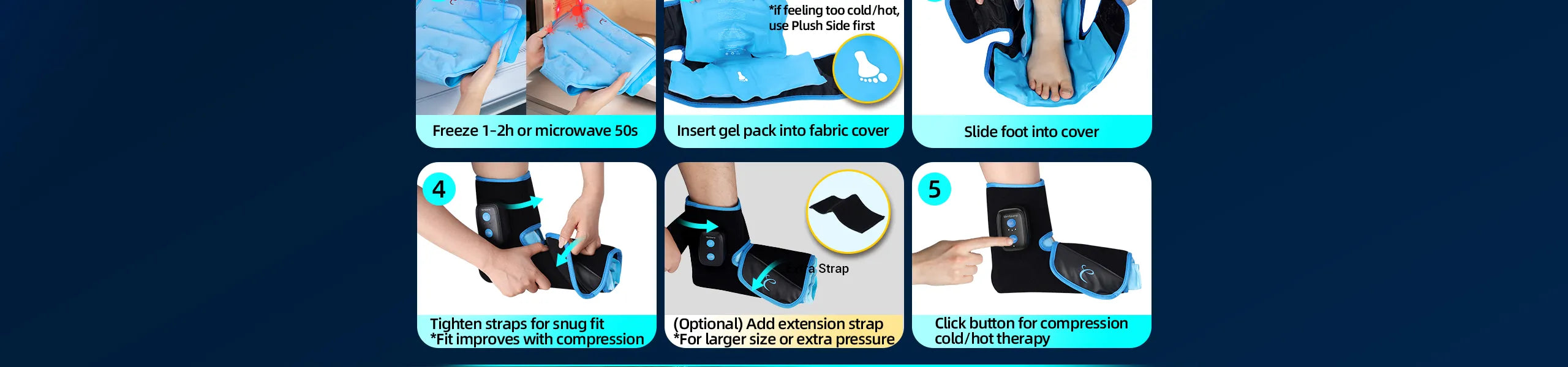 Accelerated Relief:Auto Compression Full Foot Ankle Ice Pack is inspired by the Ice and Compression principles from the R.I.C.E. method—commonly used to support recovery after minor injuries. While R.I.C.E. stands for Rest, Ice, Compression, and Elevation, our design emphasizes combining cold therapy with wearable compression for more effective relief. It offers a practical way to manage discomfort caused by plantar fasciitis, Achilles tendonitis, heel spurs, swelling, sprains, and other common foot or ankle problems—especially helpful in the early hours of discomfort. Deeper Hot & Cold Therapy:This device provides both dynamic and static compression to support recovery. Users can adjust modes as needed, but we recommend cold therapy with dynamic mode during the Acute Injury Phase (0-72 h) to reduce pain and flush out inflammatory substances, or switch to static mode for steady pressure that functions like an ankle support brace. In the Recovery Phase (Day 4+), hot therapy with dynamic compression is recommended to promote tissue repair, reduce stiffness, and speed up healing. Compared to a standard foot ice pack, it delivers deeper, more effective relief. Safe Pressure:According to Therapeutic Modalities in Rehabilitation by William E. Prentice, it is recommended to maintain compression between 20–60 mmHg during the acute phase of injury, as excessive pressure may cause secondary damage. Our device is preset to a safe 30–60 mmHg range—roughly equal to the weight of half to one full soda can—providing effective support while minimizing risk. If the pressure feels too light, you may gradually tighten the straps as your recovery progresses. Remember, more pressure isn’t always better—always follow your doctor’s advice. Supports US size 6-10:To suit more users, we include an adjustable extension strap. The gel cold pack sleeve supports US shoe size 6-10—covering nearly everyone, from athletes to office workers, busy parents, and retirees. Tighten or loosen the strap to find your perfect pressure for ankle pain relief, gout, or post‑surgery swelling, ensuring an ideal relief experience for both men and women. Thoughtful Dual-Side Design:Our ice pack for injuries reusable features two sides: Quick-Cool Nylon for stronger chill and Plush Thermo-Shield for gentler warmth. Choose based on your comfort, or wear socks to reduce the risk of frostbite or burns. The ergonomic sleeve contours to your foot for full-foot relief—whether sitting, lying, or standing. No more awkward handheld packs or staying stuck in bed while missing FIFA Club World Cup, Dipsea Race, NBA, or World Cup moments.