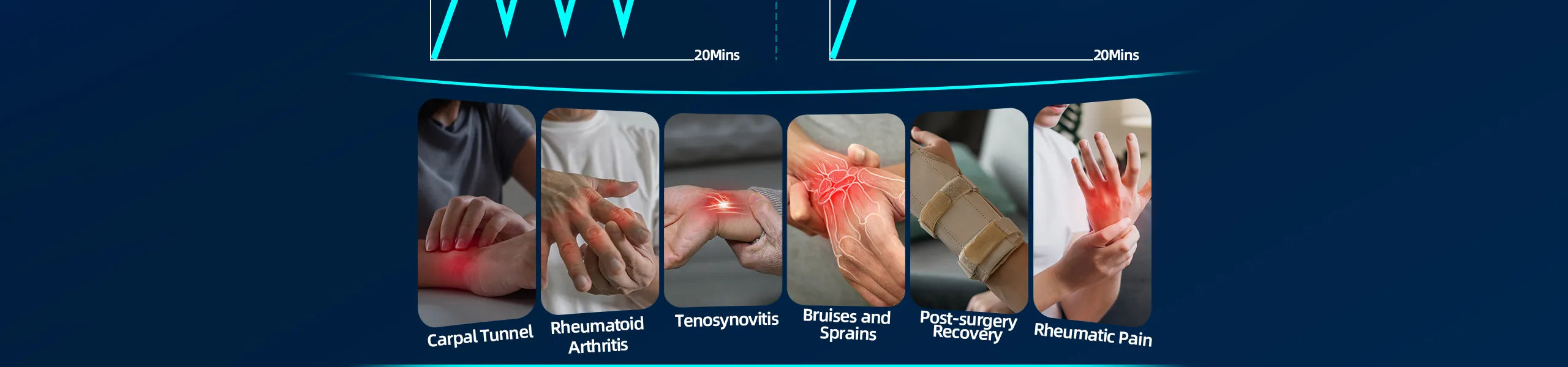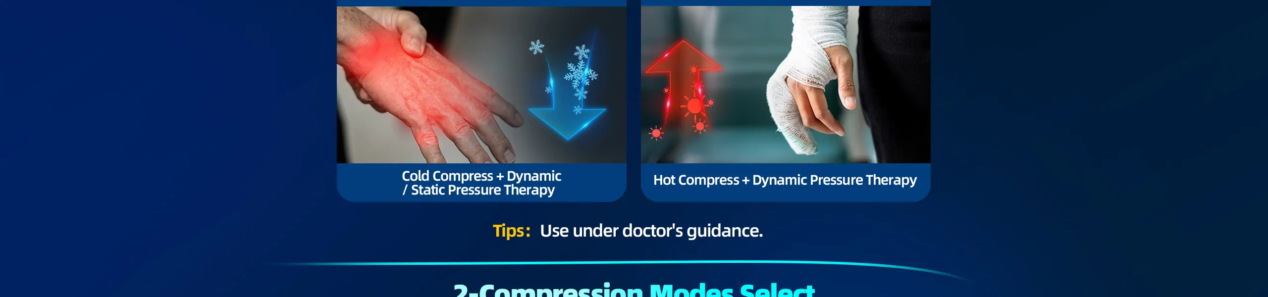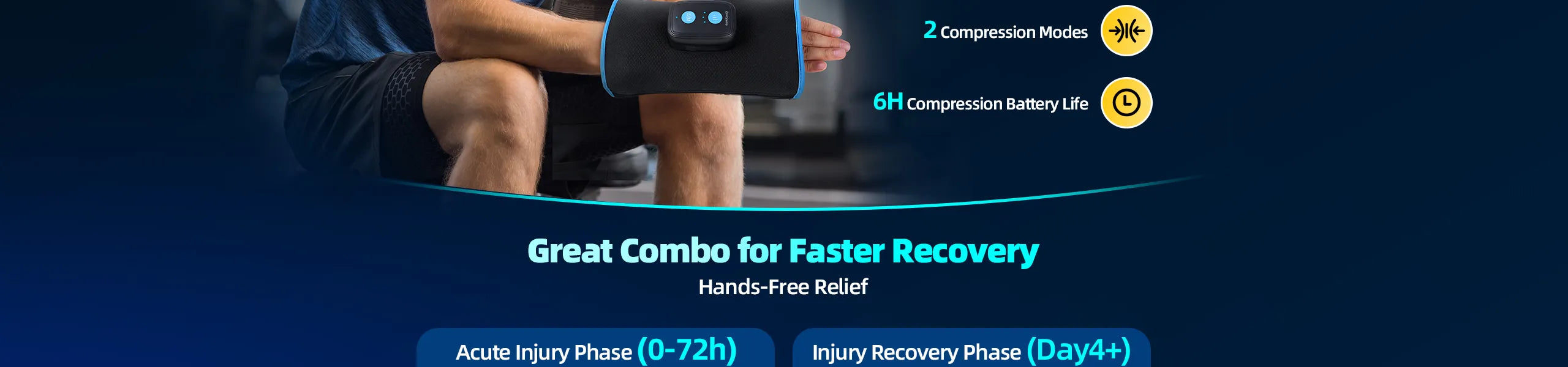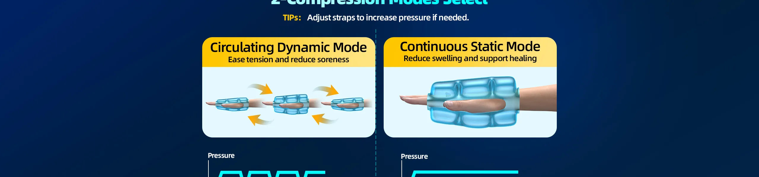 Scientific Accelerated Relief : Drawing on the proven principles of the R.I.C.E. method—Rest, Ice, Compression, Elevation—this wrist ice pack wrap brings together the power of cold therapy and comfortable, wearable compression to deliver targeted relief when you need it most. Perfect for easing discomfort associated with carpal tunnel, tenosynovitis, arthritis, wrist fracture, trigger thumb, swelling, sprains, and other common wrist or hand injuries, it’s your go-to support for those first critical hours when symptoms start. Deeper Hot & Cold Therapy: Go beyond basic ice packs with a device that combines dynamic and static compression with targeted hot and cold therapy. In Acute Injury Phase (0-72 h)—like a sprain or the onset of carpal tunnel discomfort—use cold therapy with dynamic compression to soothe sharp pain, reduce swelling, and flush out inflammation, or switch to static mode for steady pressure that functions like a supportive wrist brace. In the Recovery Phase (Day 4+), switch to heat with dynamic compression to ease stiffness, improve mobility, and promote healing in deeper tissues. Ideal for tendon strain, arthritis, wrist fracture, or post-repetitive stress recovery. Safe Pressure: Our smart wrist compression sleeve does the work for you automatically. With three preset intensity levels, it delivers even, consistent relief across your wrist, thumb, and fingers. No manual squeezing, just press a button to start, and toggle between modes for a soothing relief. If you prefer stronger compression, simply tighten the straps or use the static mode and high intensity. Let this auto compression wrist ice pack quietly ease your pain away, so you can focus on what matters. For Every Hand : Designed to fit nearly every hand, this wrist ice pack wrap measures 9.4 inches in length and circumference from 14" to 15" inches(top/bottom). Whether you're a fitness enthusiast pushing through a workout injury, an office worker easing repetitive strain, a musician recovering after long hours of practice, or someone in post-surgery rehab—this hand ice pack comfortably accommodates you. Pull straps to find your perfect pressure for managing wrist pain, strains and injuries, or post-operative swelling. Men and women alike can easily achieve a secure, comfortable solution for deeper cold therapy and quicker recovery. Thoughtful Dual-Side Design: Perfect as a practical and caring gift, our reusable ice pack for injuries features two sides - the nylon side delivers a deeper chill for more intense therapy when needed, while the plush side provides gentle, comfortable chilling for soothing relief. For milder therapy, simply switch to the plush side or wrap it in a thin towel. Tip: If the gel pack becomes too stiff or cold after prolonged freezing, let it sit at room temperature for a few minutes before use or use hot therapy. An ideal present for anyone seeking recovery and comfort!