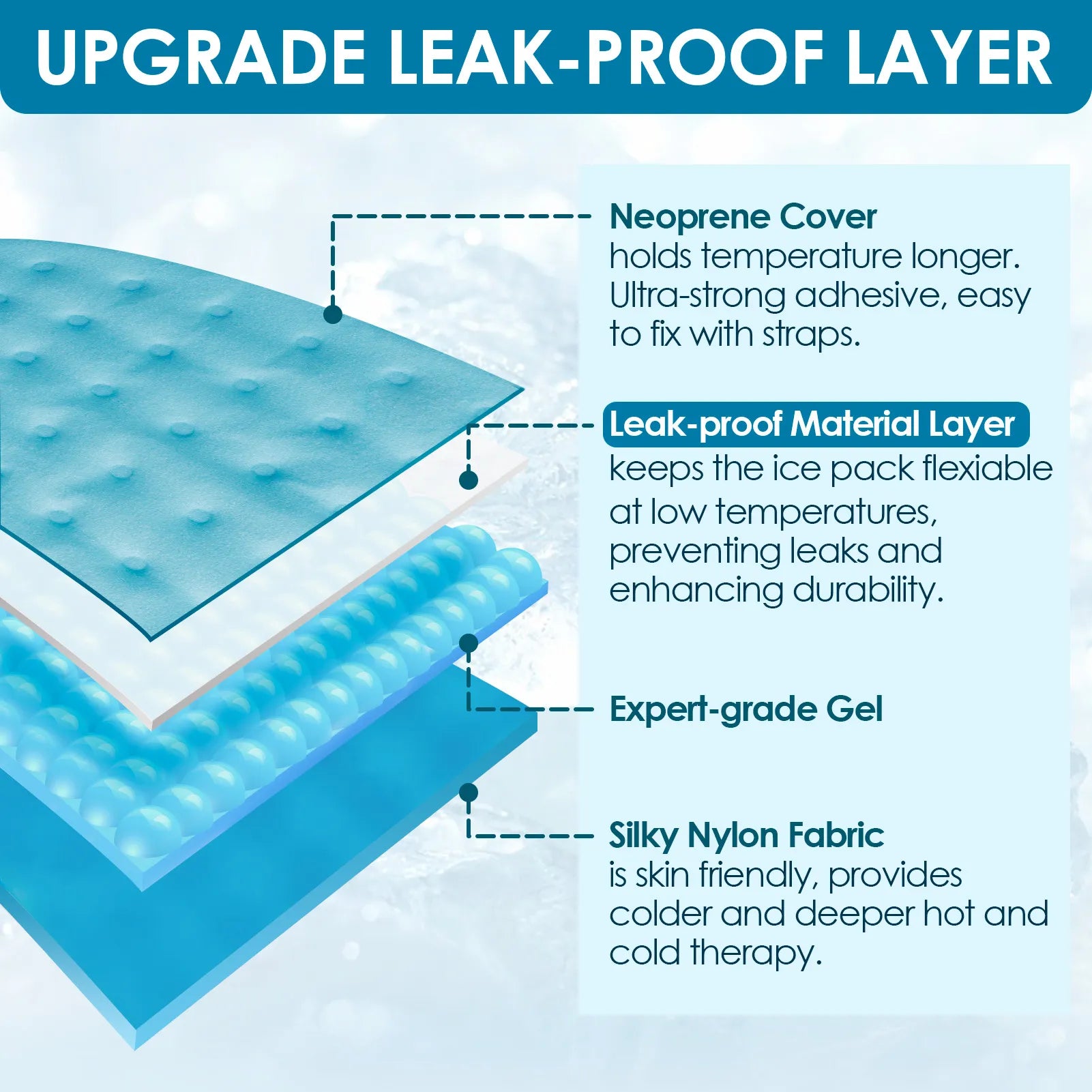 Upgraded Leak-proof Layer: Keeps the ice bag more flexiable at low temperatures, preventing leaks and enhancing durability. Lined with nylon fabric, provides with you of a deeper cold and hot compress. Apply immediately after an injury to control swelling and inflammation of soft tissue, helping alleviate pain from a leg injury. This reusable ice pack is perfect for athletes, runners, basketball players, tennis, soccer, etc., housewives, pregnant women, workers, seniors, etc.