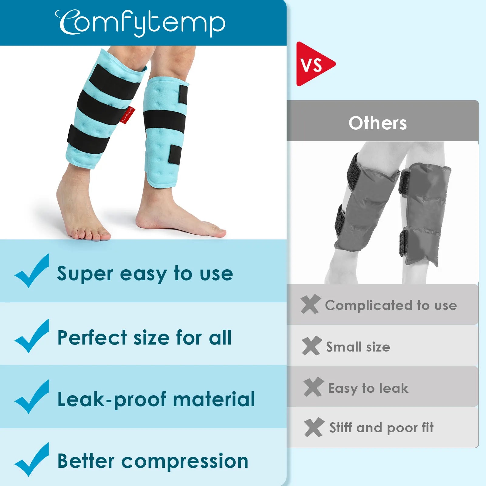Expanded Cover Calf & Shin Splint and Elbow Ice Pack: The effective coverage area of Comfytemp gel ice pack is twice as big as some others. Up to 26.8 inches for calf circumference, the size ensures perfect fit for any body type. Provides full coverage of the arms and Shin Splint, providing immediate, deep relief after exercise and injury, and helps reduce swelling. It is an effective treatment for post-exercise elbow injuries, calf strain and shin pain. It's a life saver after a long day!