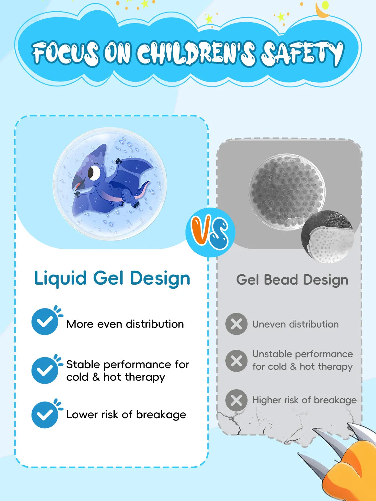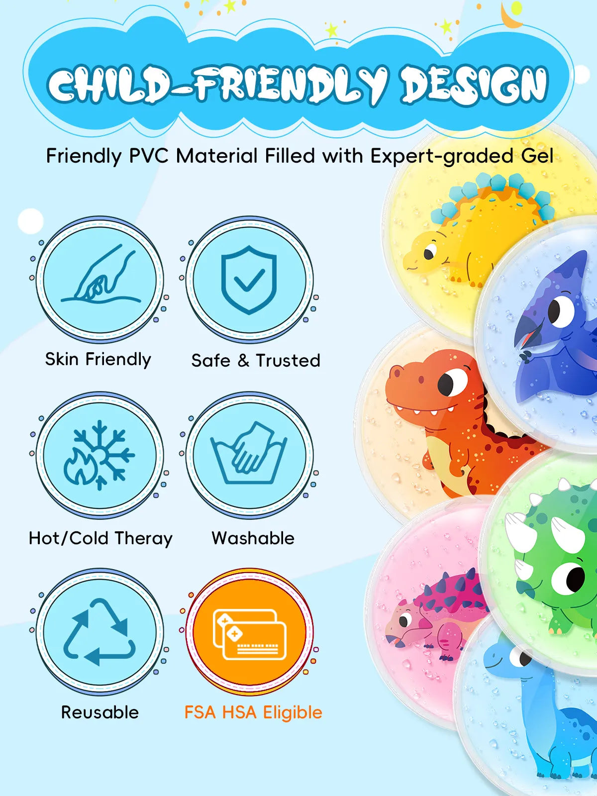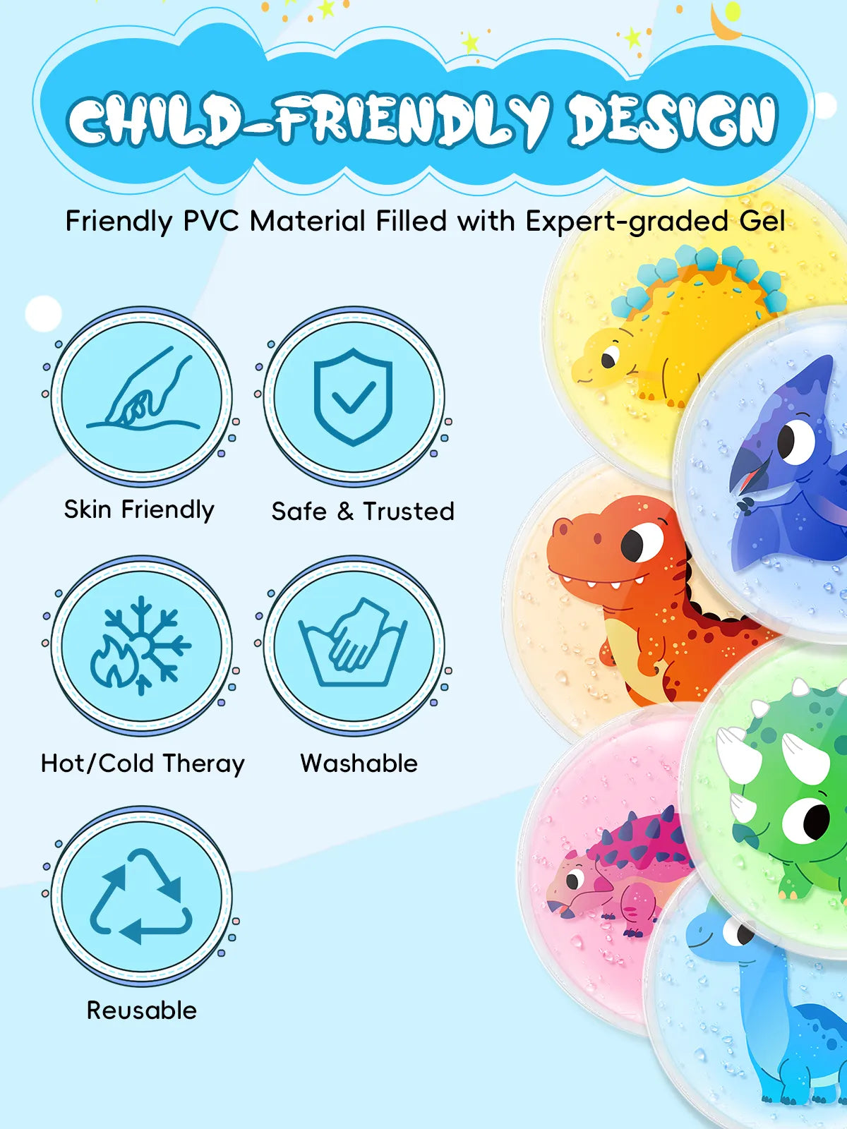 Roar Like a Dinosaur: Safe & Trusted Gel: These soft gel ice packs are made of environmentally friendly PVC and filled with non-toxic expert-grade gel, which is completely safe and trusted for kids' sensitive skin. These reusable ice packs for injuries are washable and are flexible and comfortable to place on injury.