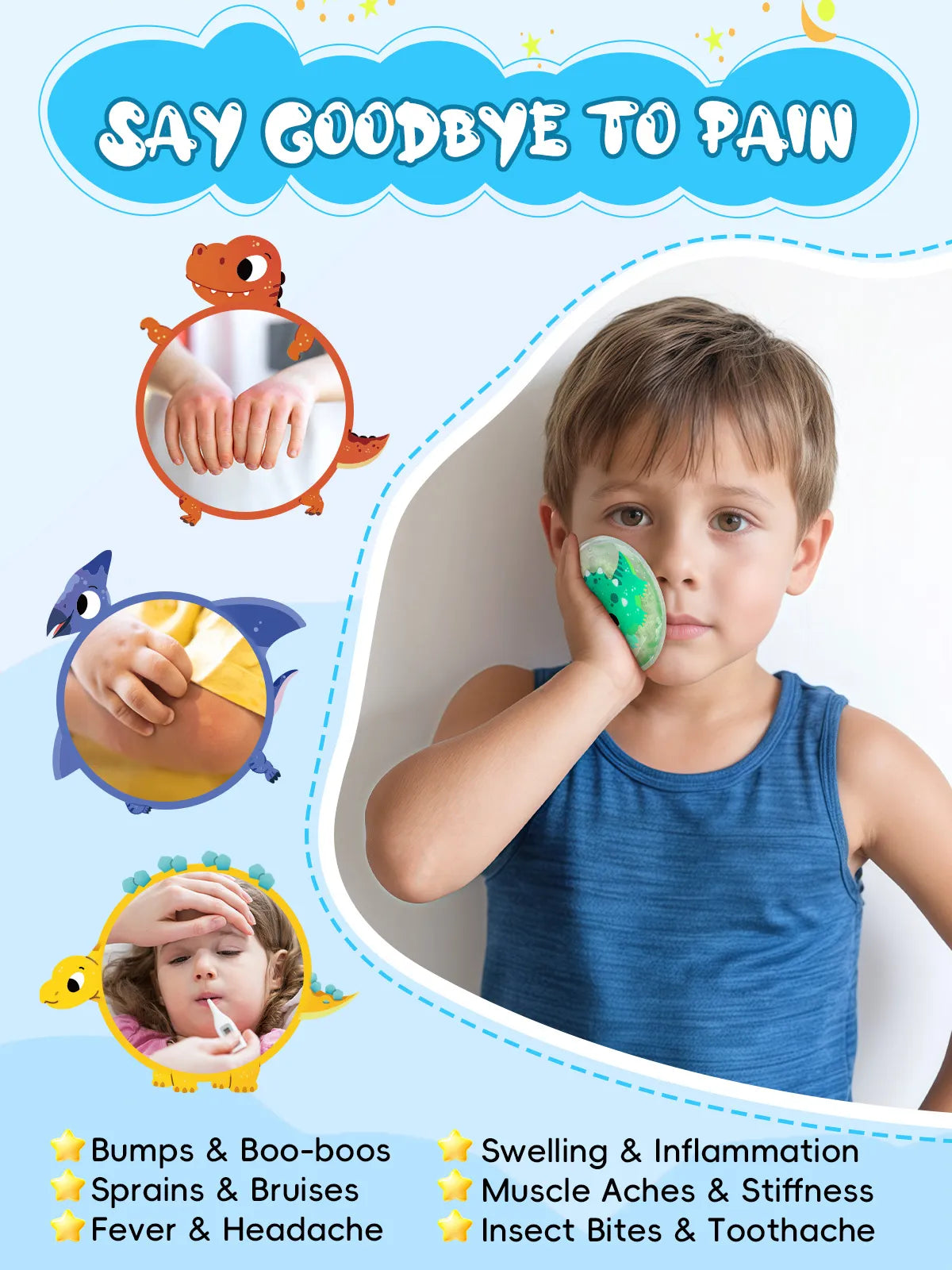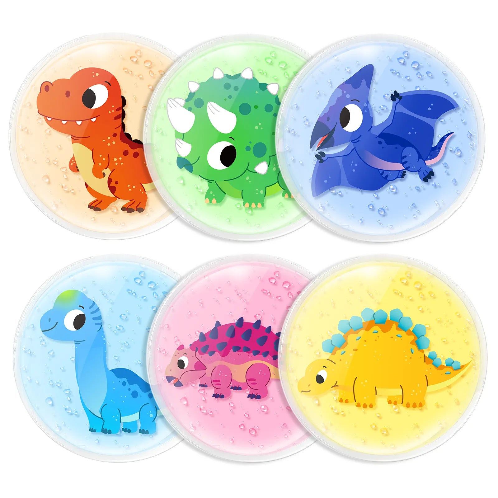 Bye Bye Boo Boos: 6 Cute Dinosaur Patterns: Kids ice packs are perfect for the little bumps and kids' boo-boos. With cute dinosaur patterns of T. rex, Triceratops, Pterosaur, Brachiosaurus, Spinosaurus and Ankylosaurus, these ice packs provide comfort & distraction to help your boys or girls forget about their injuries, fever, nose bleeds, toothache, allergies, and more. The cute dinosaur reusable gel ice packs for injuries are suitable for boys or girls.