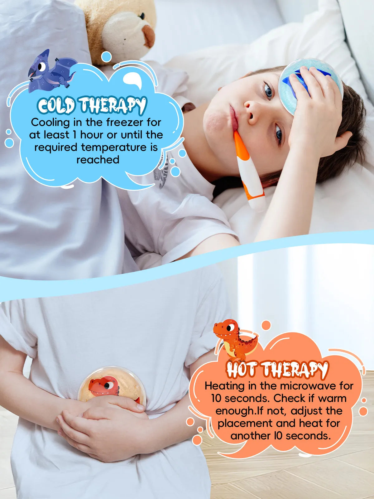 Dino-Power to the rescue: Hot & Cold Compress Pain Relief: Cooling in the freezer for at least 1 hour or until the required temperature is reached. Heated the ice packs in the microwave for 10 seconds. Check the temperature is warm enough. If not, adjust the placement and heat for another 10 seconds. If you have these reusable gel ice packs for injuries, the natural remedy is safe for daily use and can be part of any rehabilitation or recovery program.