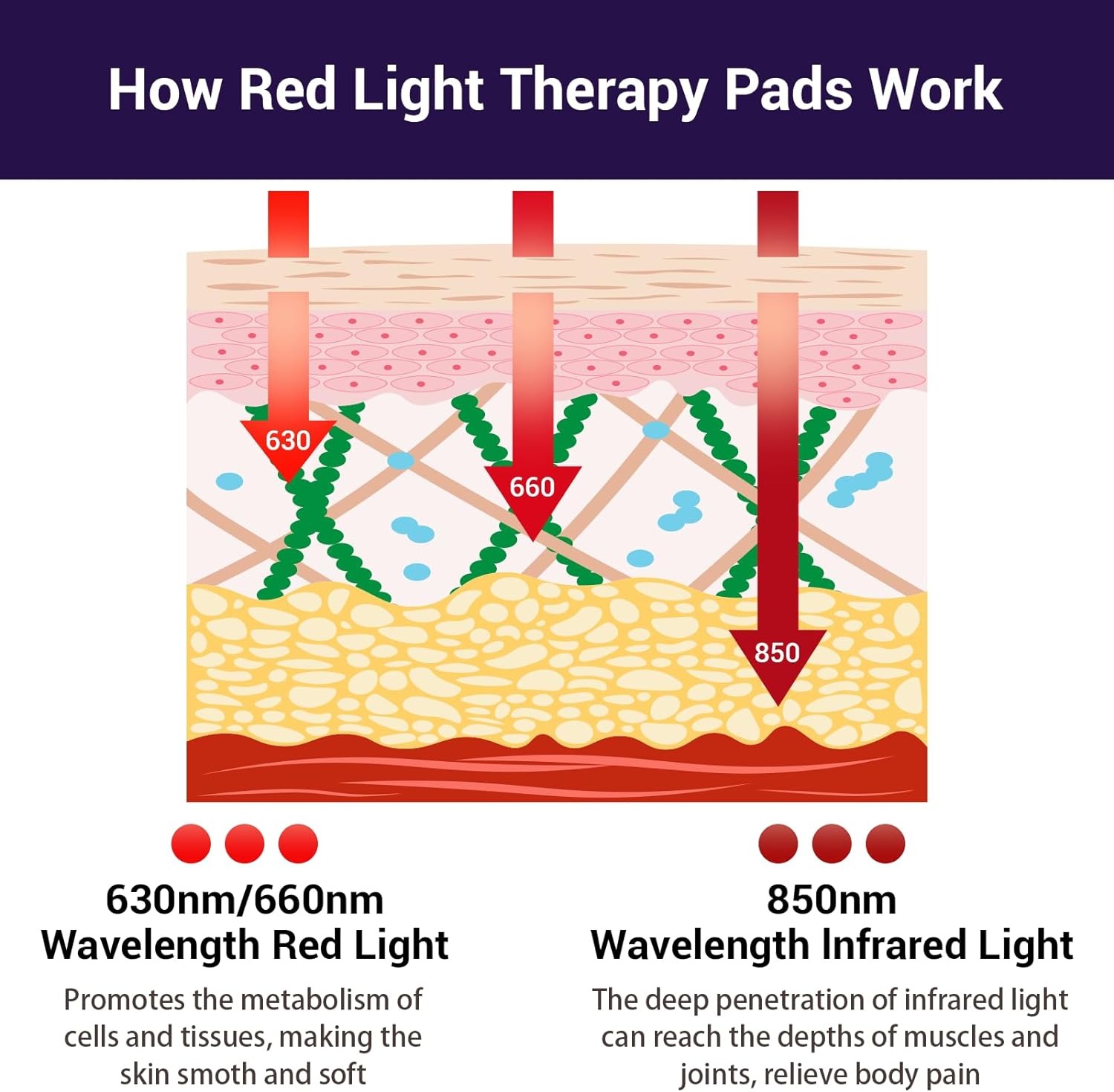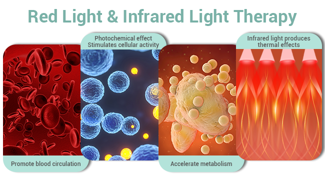 - [Healthy Red Light] The red light is known as the light of life which is healthy and safe to our body, 850 nm near infrared light (invisible light) penetrates deep into tissue cells to help relieve pain and increase blood circulation, reduce inflammation and joint pain, relieve muscle sorness, promote cell regeneration and fat lose. 660 nm red light (visible light) acts on the epidermis to improve skin appearance, accelerate healing after sports injuries.