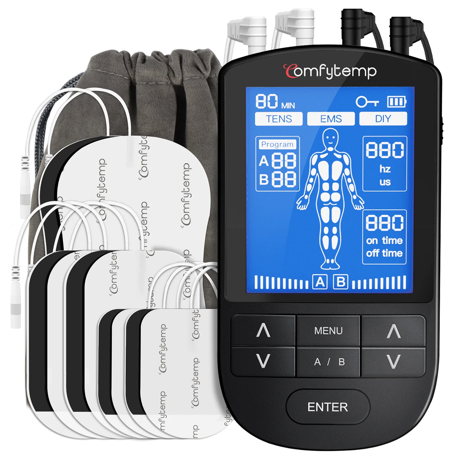 4 Outputs for More Choices: The Comfytemp 4-channel muscle stimulator provides broader pain relief than dual-channel TENS units. It features 24 modes (20 preset + 4 customizable) and 20 adjustable intensity levels, with session timers from 10 to 90 minutes. Its independent A/B channels operate in separate modes and intensities for targeted therapy. Designed for versatility, the device allows dual-channel customization to address multiple muscle zones at once, enhancing rehabilitation or relaxation efficiency. The compact pulse massager combines clinical-grade settings with user-friendly controls, making it ideal for home or professional pain management needs.