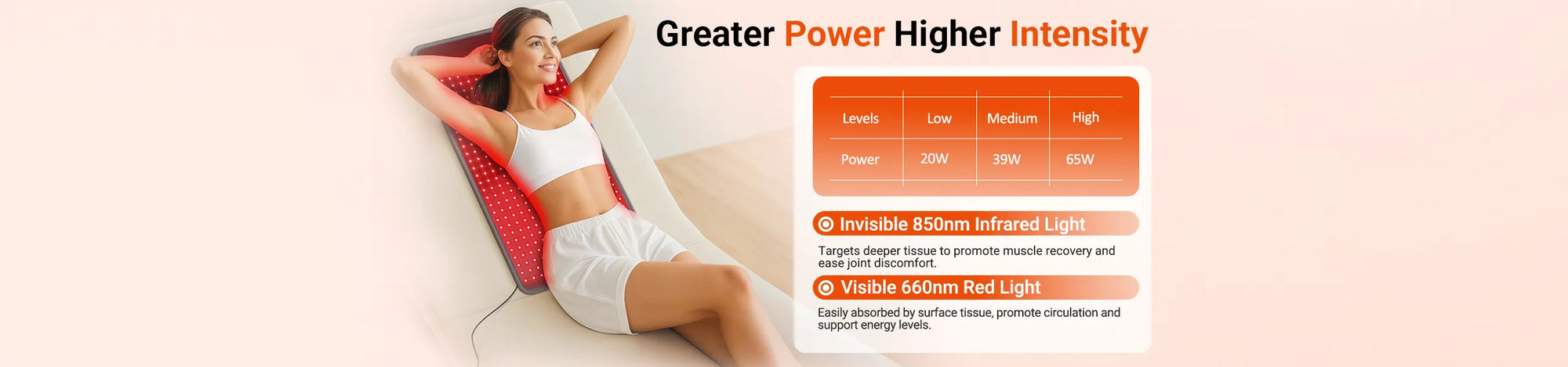 Up to 65W Power: This red light pad offers power up to 65W. At the 0-inch distance from the LEDs, the light irradiance can reach up to 180mW/cm² on the highest setting. Light irradiance for deeper areas usually needs to be over 50 mW/cm².