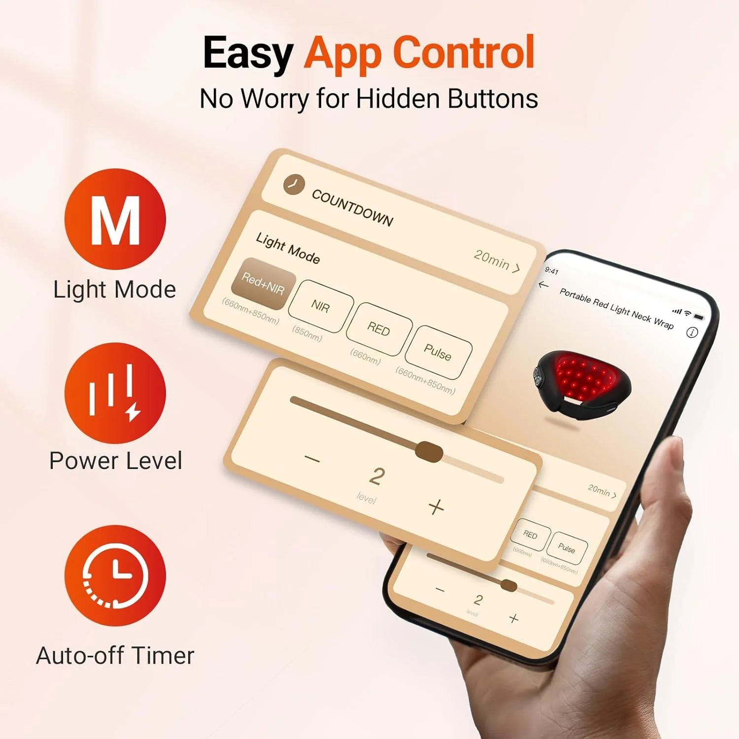 Dual App & Button Controls: In addition to onboard buttons, the neck wrap can be controlled remotely via a app. Easily switch between 4 light modes and 3 intensity levels even while wearing it, so there’s no need to fumble for buttons. Simple and intuitive to operate. In standalone mode, it turns off automatically after 20 minutes, while the app offers more timing options from 5 to 30 minutes to meet different needs.