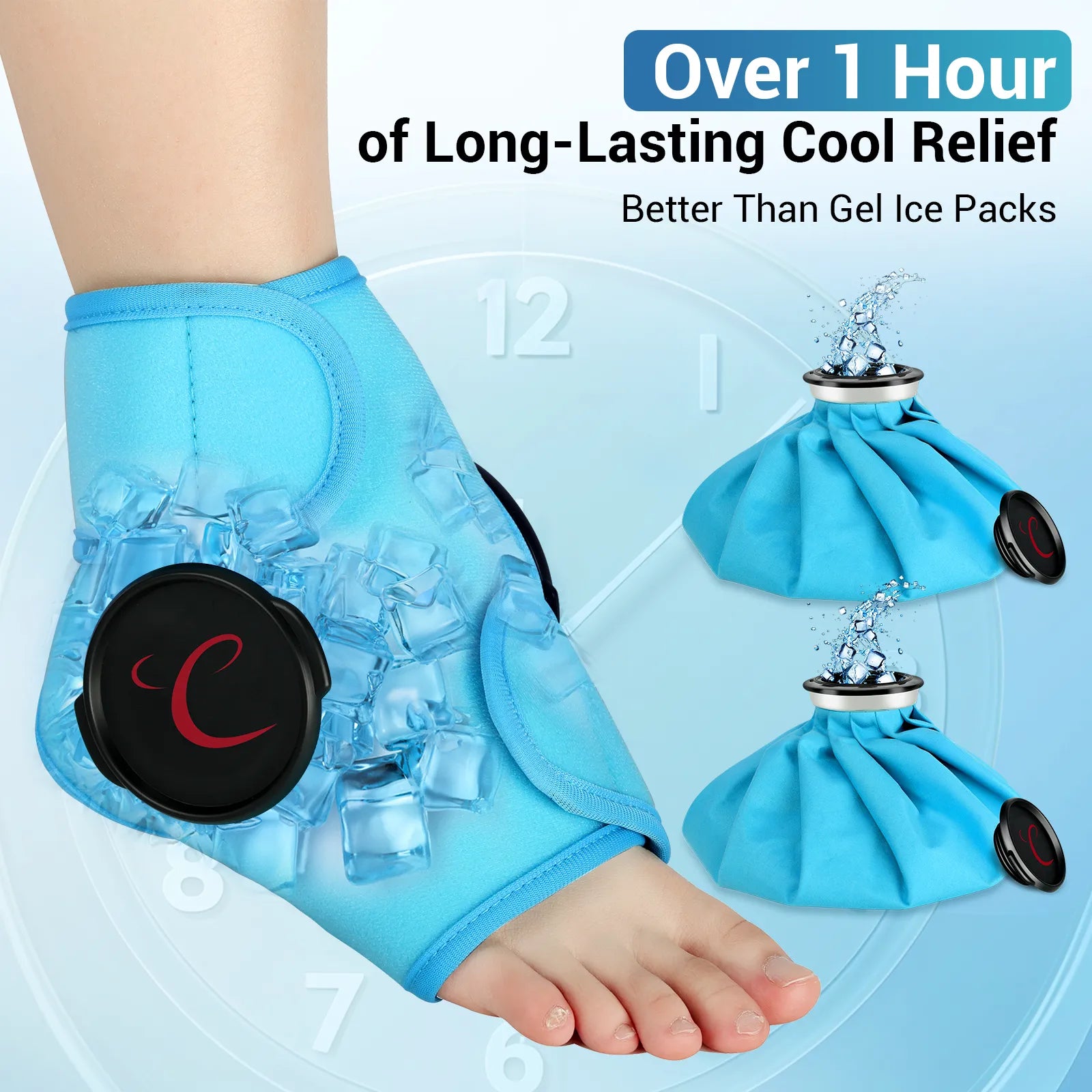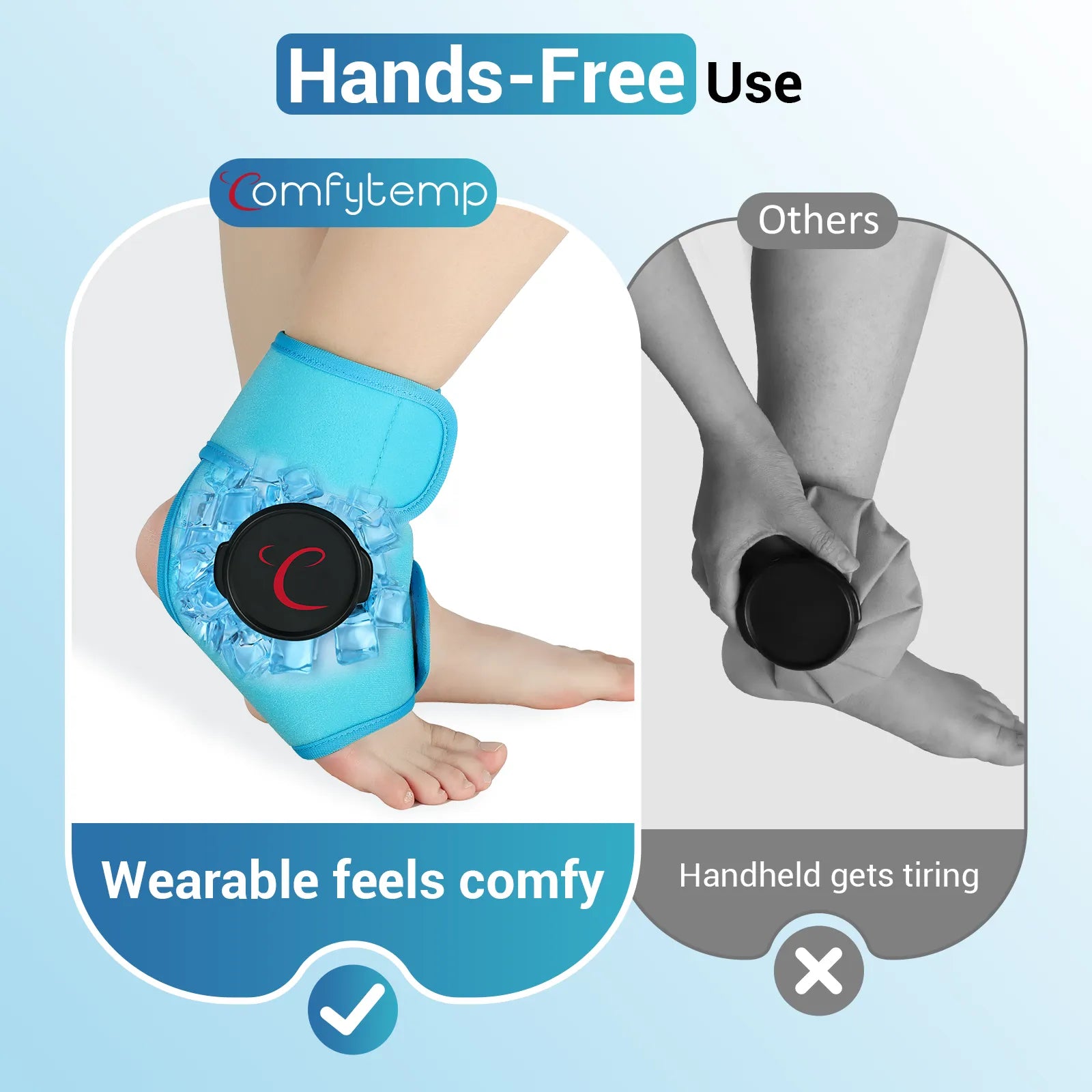 Superior Deeper Colder and Longer Ankle Pain Relief, That's Why Choose Comfytemp Reusable Ankle Ice Bags Wrap for Injuries. Come with 1 wearable ankle wrap and 2 refillable ice bags, Comfytemp offers localized cryotherapy at temperatures as low as 32°F for up to 2.5 hours, much longer than traditional gel ice packs. This extended cold therapy ensures maximum relief from pain and swelling, making it more effective and durable solution for injury treatment and recovery than those warm up quickly.