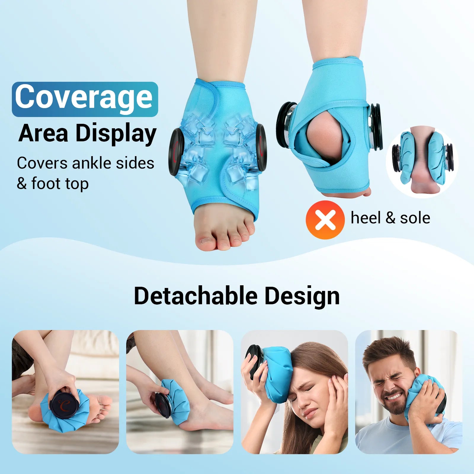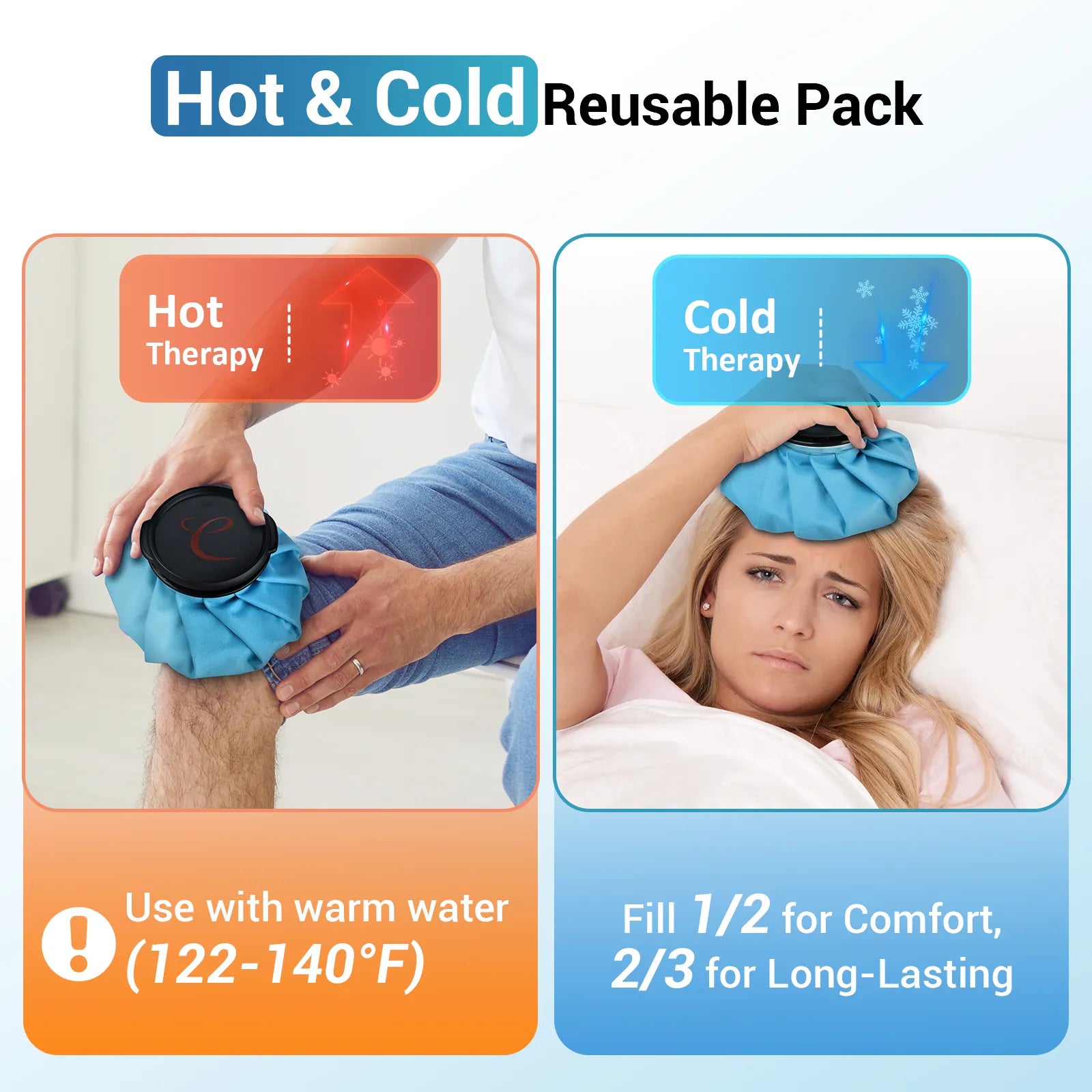 Reusable, Versatile Cold Therapy for Total Body Relief. Comfytemp Ice Pack features a unique detachable design that lets you use the pack independently. Add hot water to alleviate joint injuries, menstrual cramps, muscle stiffness, and migraines—or use cold therapy. It can also be secured with a strap on areas like your calves or forearms for targeted pain relief. Note: For hot pack use, maintain the water temperature between 50–60°C (122–140°F).