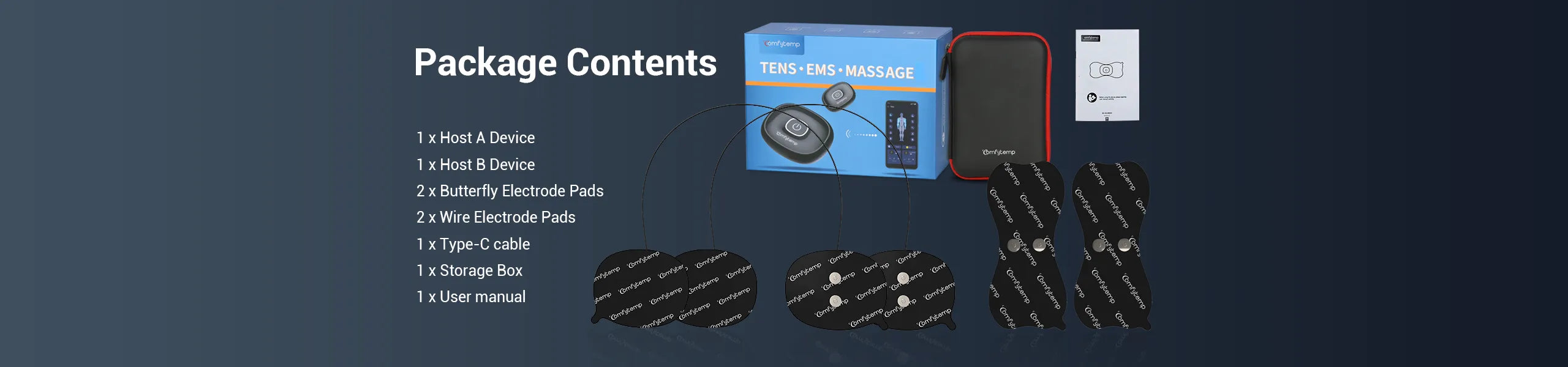 Dual Host Design: Comfytemp Cordless TENS EMS Unit allows two hosts to be used at the same time, and more importantly, we offer two types of electrodes (total 4 pcs) to meet the needs of both small and large muscle groups, precisely targeting your pain area.The strength of A/B host can be adjusted separately.Ā