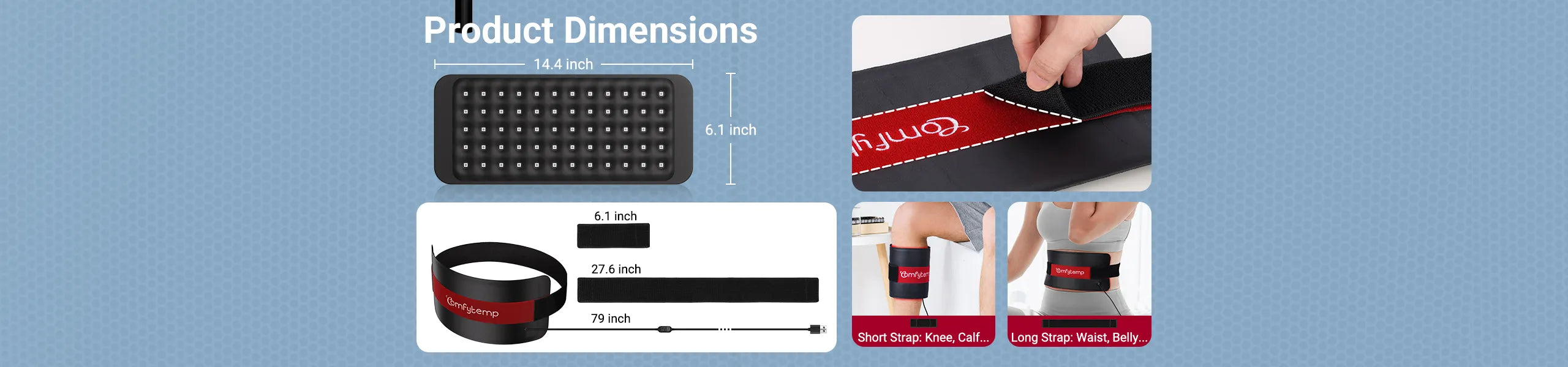 Versatile Fit on Different Body Areas: Designed at 14.4'' x 6.1'', this red light therapy pad comes with two adjustable straps (27.6'' long strap and 6.1'' short strap). The long strap comfortably wraps around the waist, back, and abdomen, while the short strap securely targets joints and muscle like knees, elbows, arms, hands, feet, legs, calf and ankles. One belt for full body relief.