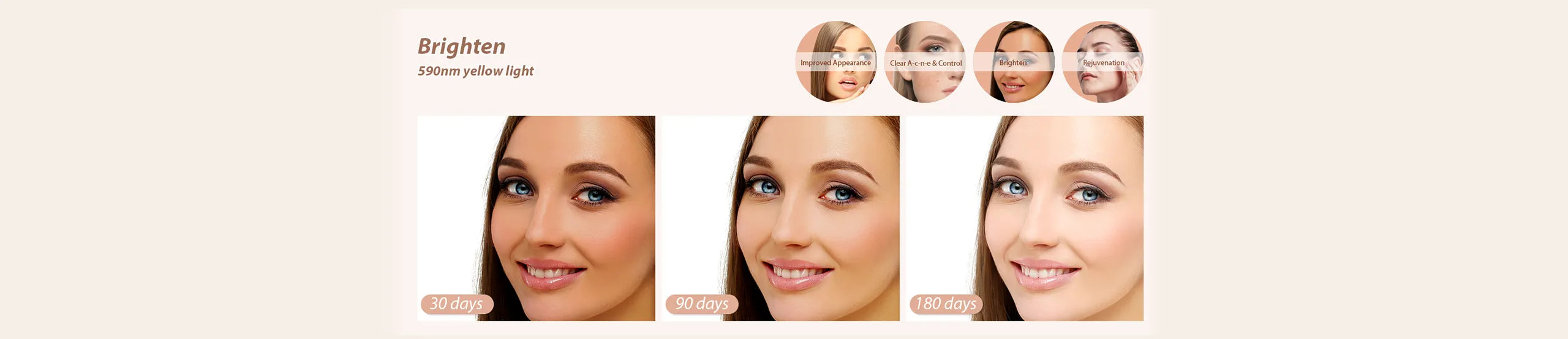 4 Modes: Repair mode is 630nm red +850nm ir, which will increase skin elasticity, promote cellular collagen production, repair aged cells. Clear mode is 460nm blue, which helps control oiliness and shrink pores. Brightening mode is 590nm yellow, which will reduce pigmentation spots and help skin brightening. Rejuvenation mode is 630nm red +850nm ir+ 460nm blue + 590nm yellow, which will repair skin, whiten the skin, tighten skin, brightening and rejuvenation.