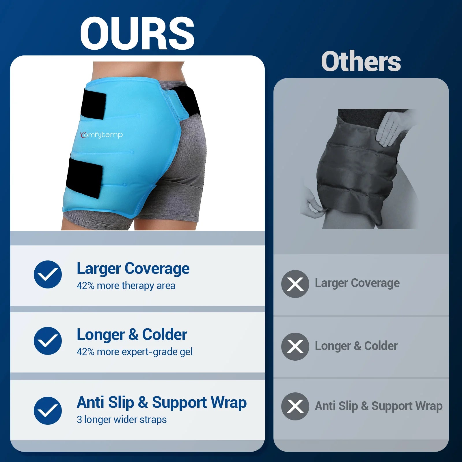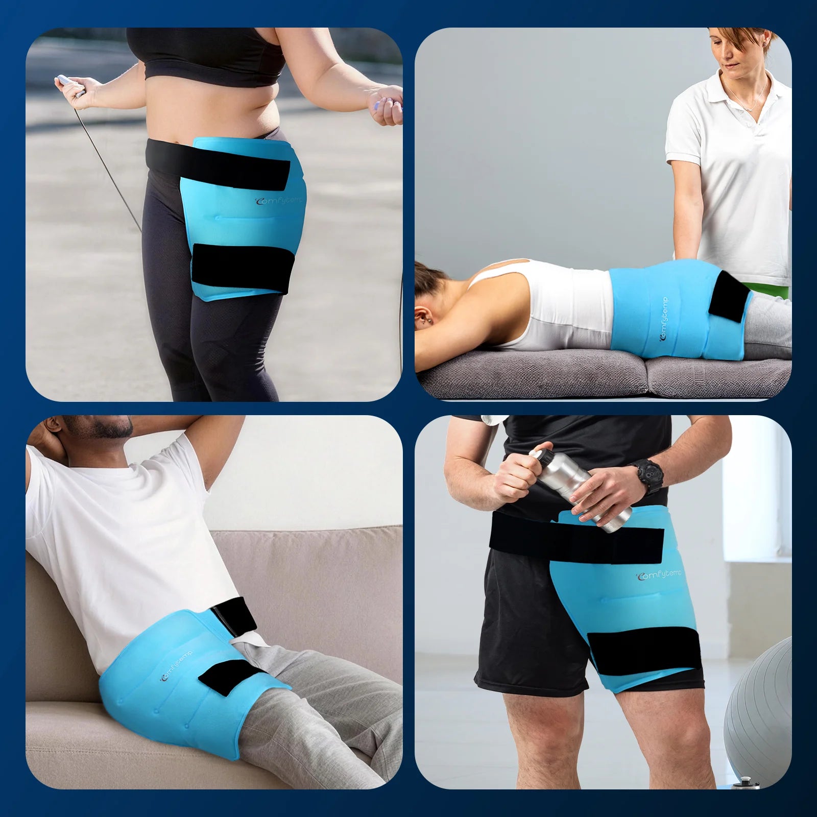 • Terapia prolongada de frío o calor de 30 minutos: La bolsa de gel reutilizable Comfytemp para la cadera proporciona más de 30 minutos de compresión fría o caliente, ideal para aliviar lesiones y acelerar la recuperación. Esta bolsa de gel alivia fracturas de cadera, ciática, bursitis de cadera, artritis, esguinces, luxación de cadera, dolor en el flexor de la cadera, dolor postoperatorio de reemplazo de cadera, desgarros del labio glenoideo, dolor muscular, síndrome del piriforme, hernias discales, inflamación, hinchazón y dolores comunes.