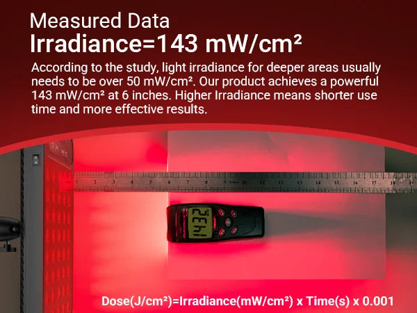 A: We recommend keeping the lamp 6 inches (≈15 cm) from your skin for optimal results — that's where it delivers 143 mW/cm² intensity. You can adjust the distance based on personal comfort.