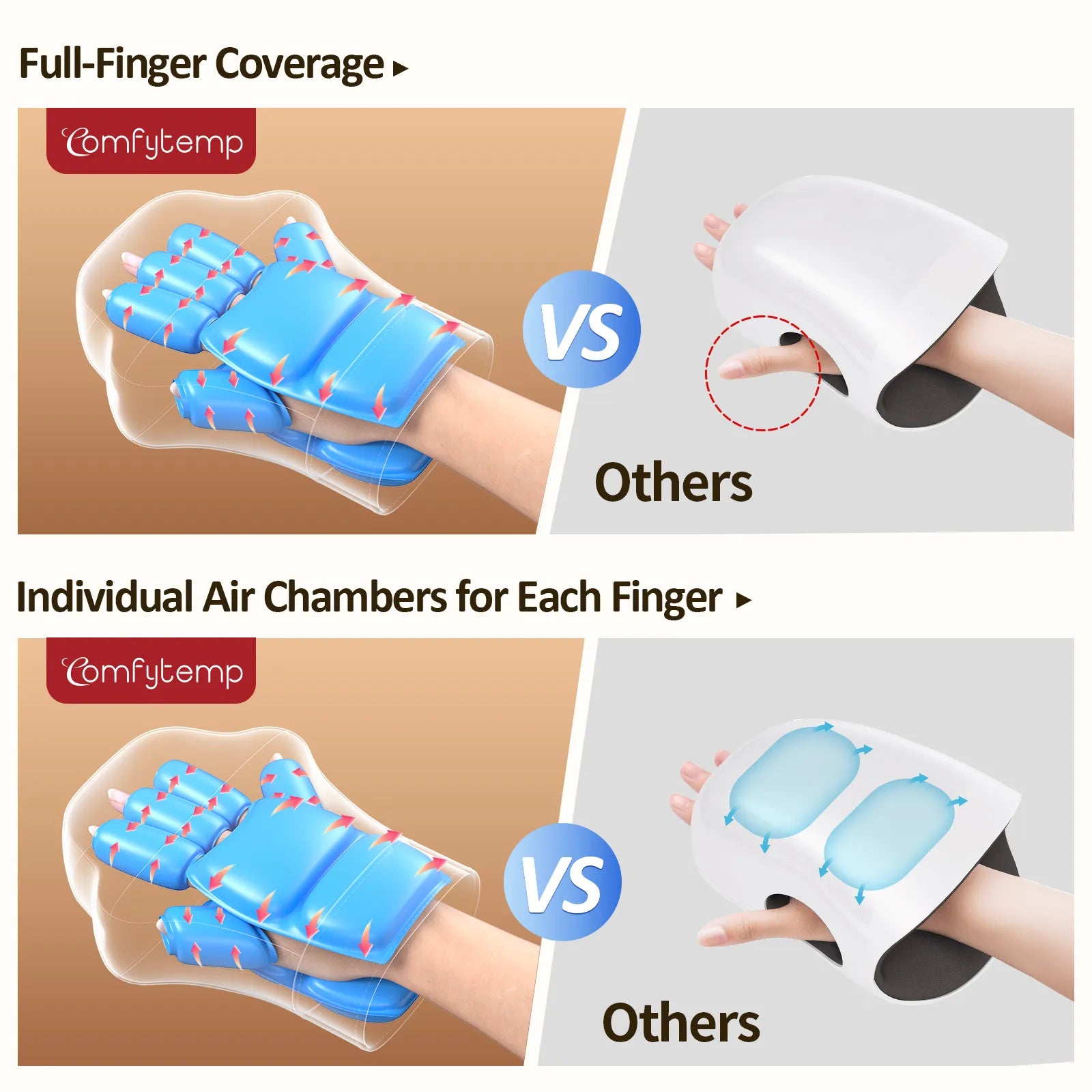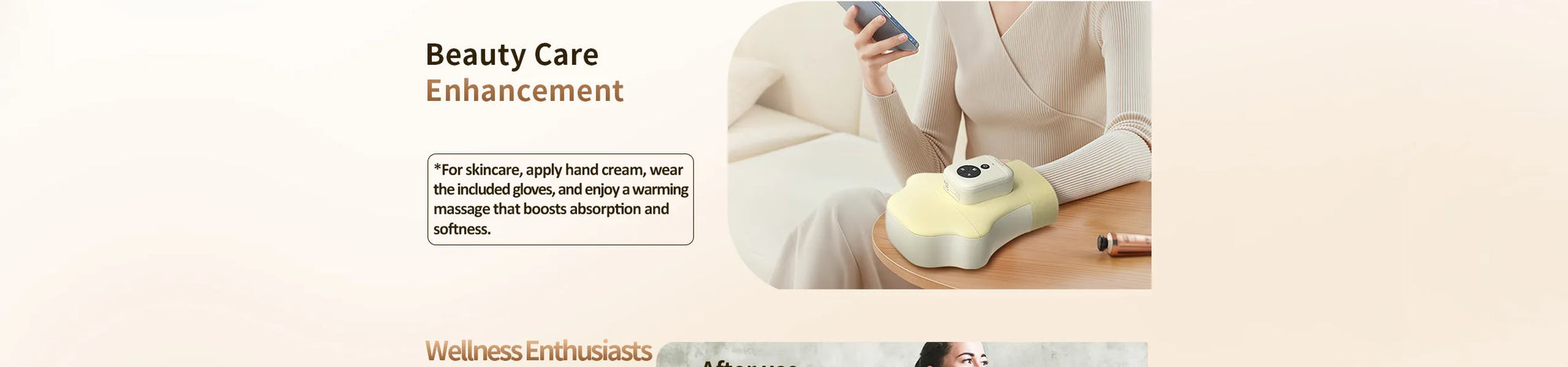 Independent Fingers Massage: Unlike ordinary hand massagers that treat the hand as a whole, this device provides dedicated compression for each finger to deliver precise relief from stiffness, fatigue, and numbness. Ideal for office workers, gamers, and those with arthritis or carpal tunnel, it restores comfort after long hours of typing or crafting. For skincare, apply hand cream, wear the included gloves, and enjoy a warming massage that boosts absorption and softness.