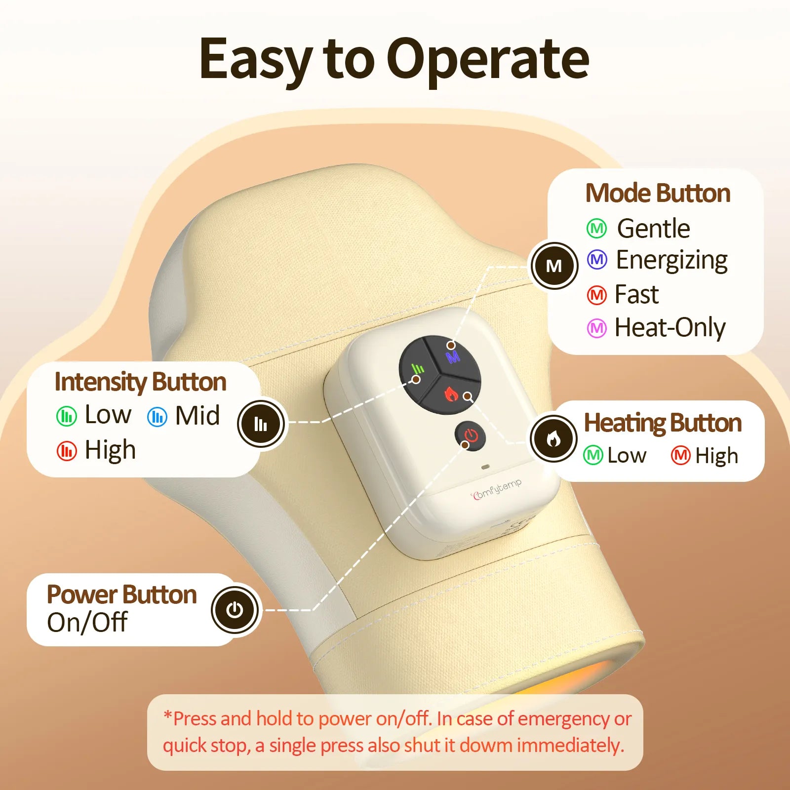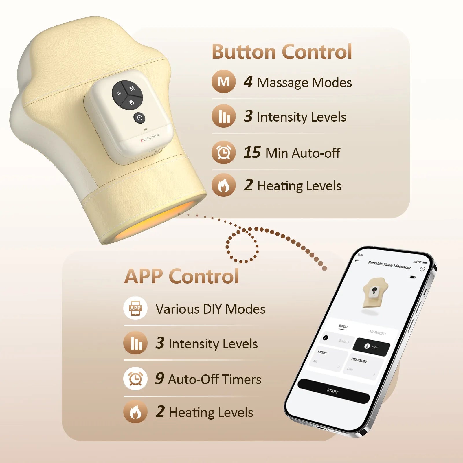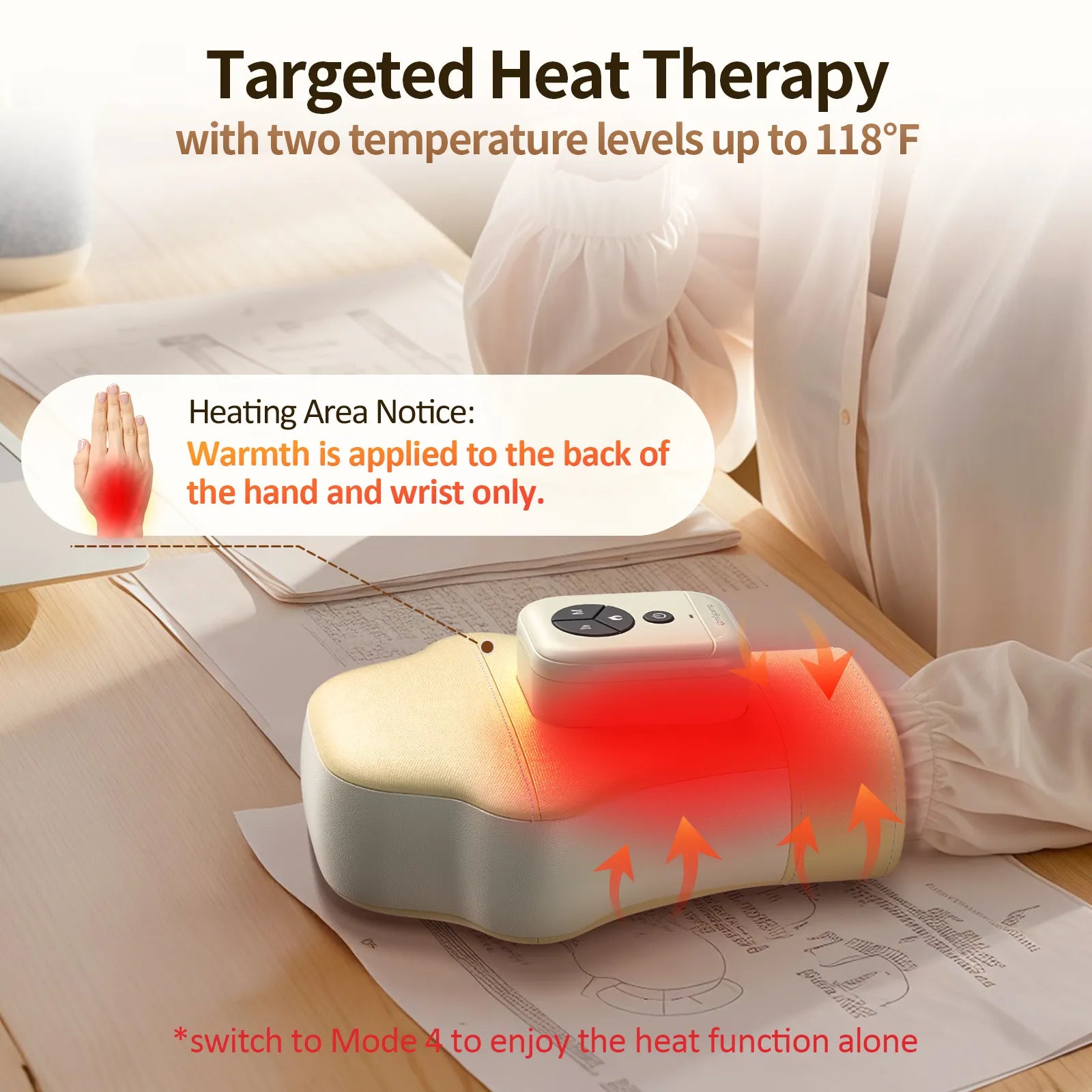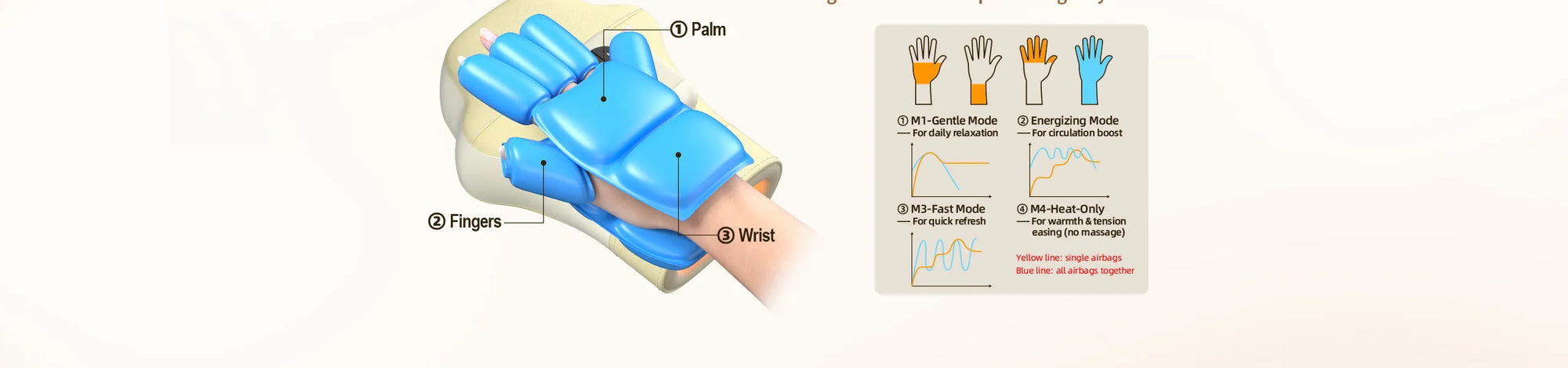 Dual Control Options: Easily switch between onboard buttons or the intuitive App to control your massage. Choose from 4 preset modes, 3 intensity levels, and 2 heat settings to meet different comfort needs. Through the App, you can further customize each airbag's inflation time and area for a fully personalized experience—ideal for soothing arthritis pain, stiffness, and everyday hand fatigue.