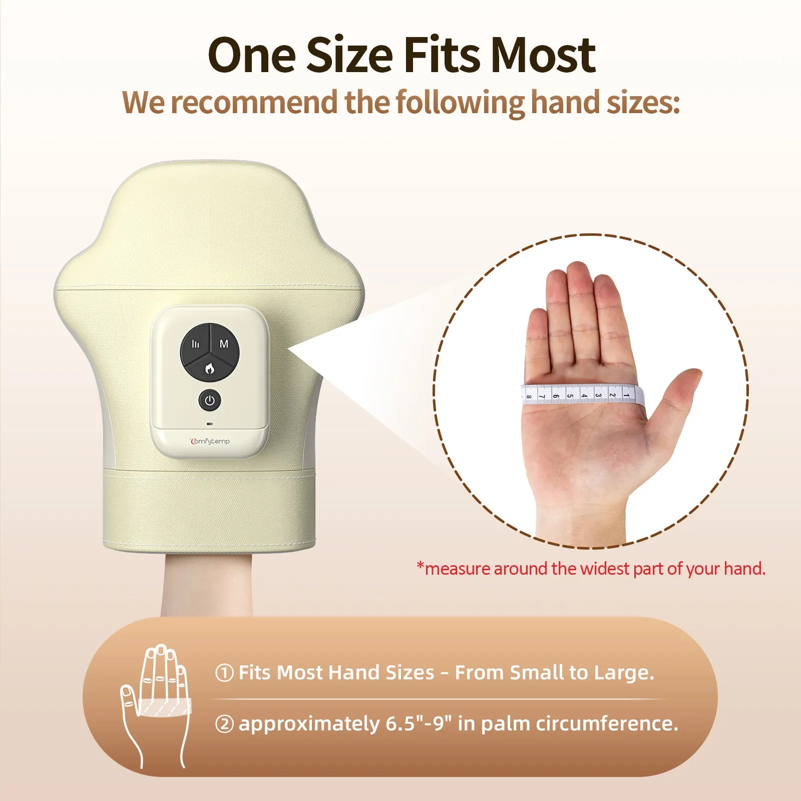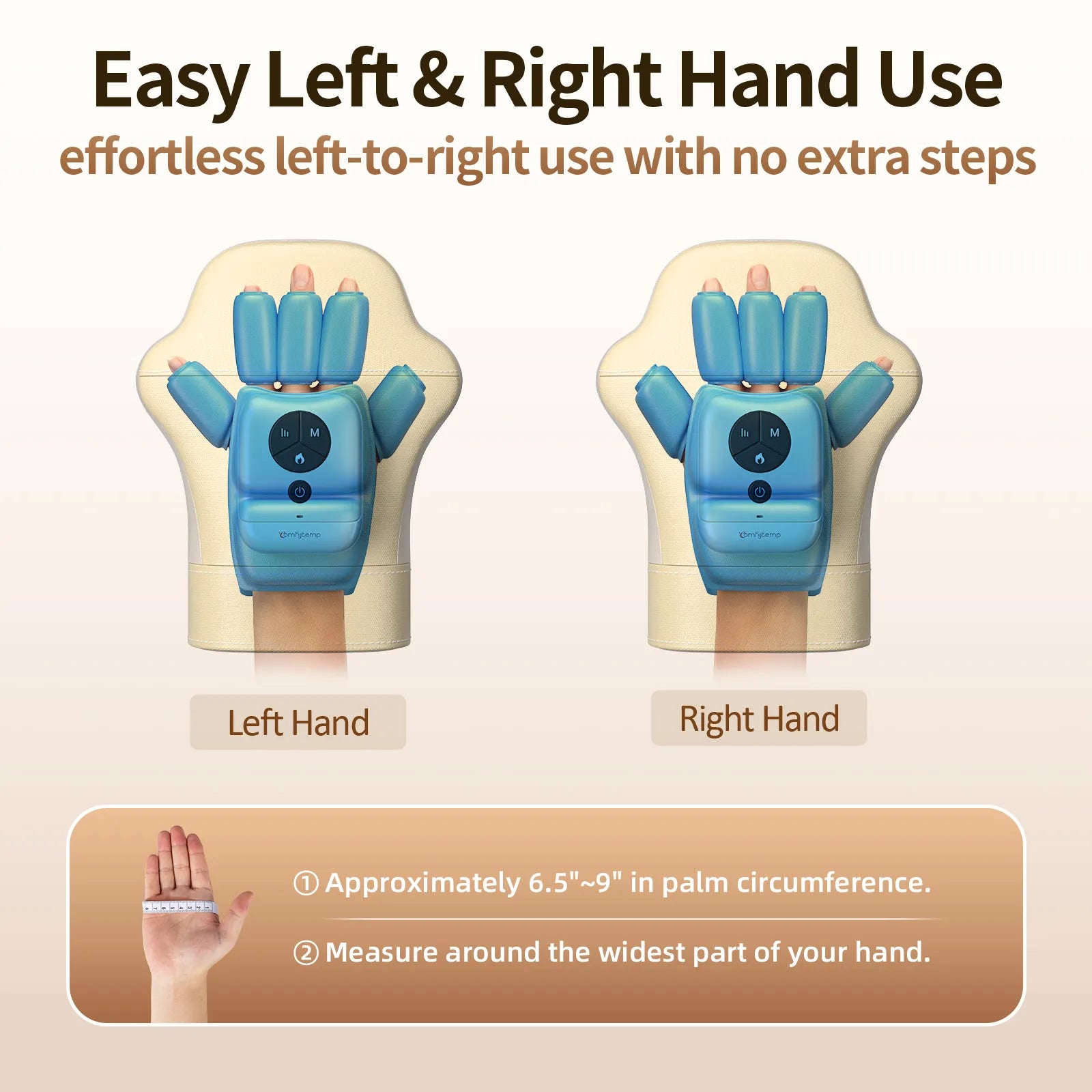 Easy Left & Right Hand Use: Unlike traditional hand massagers that require flipping the device when switching hands, our upgraded design allows effortless left-to-right use with no extra steps. Designed to fit a wide range of hand sizes (palm circumference 6.5"–9"), it's ideal for men and women alike. Whether you suffer from strain due to typing, housework, or hobbies like knitting or gaming, you'll enjoy convenient, tailored relief anytime.