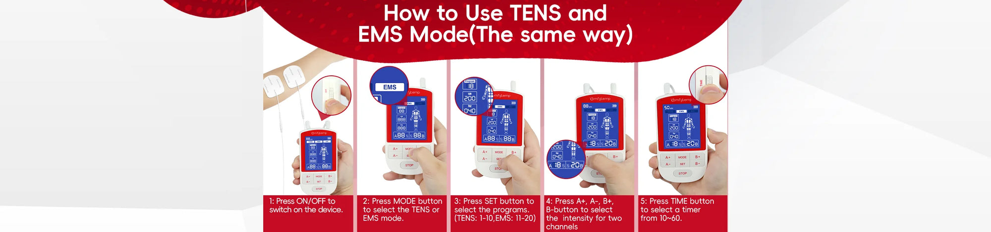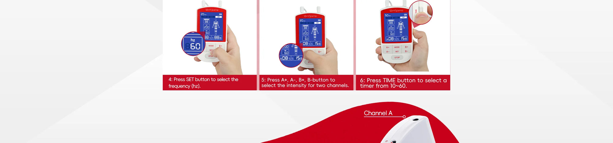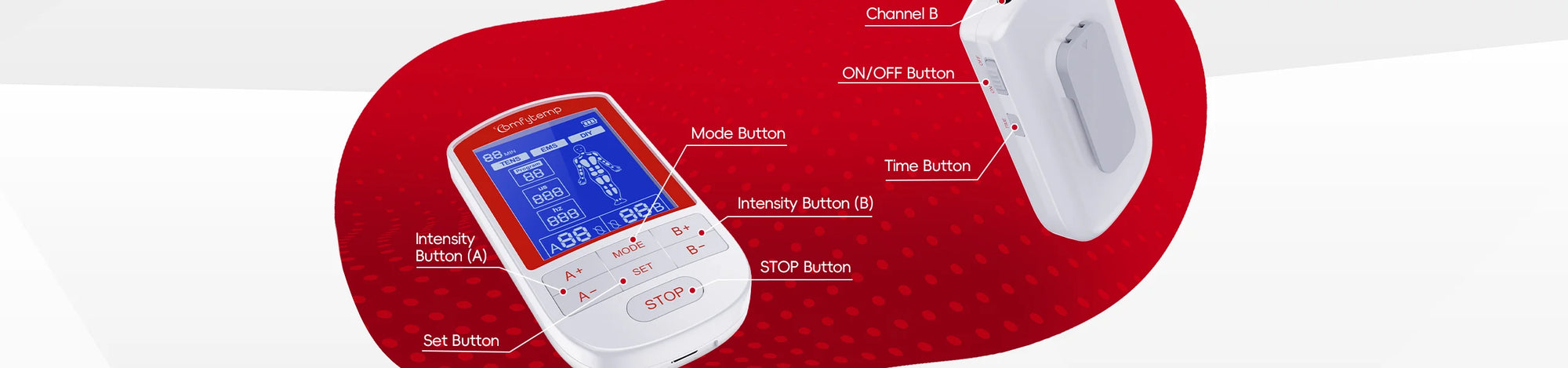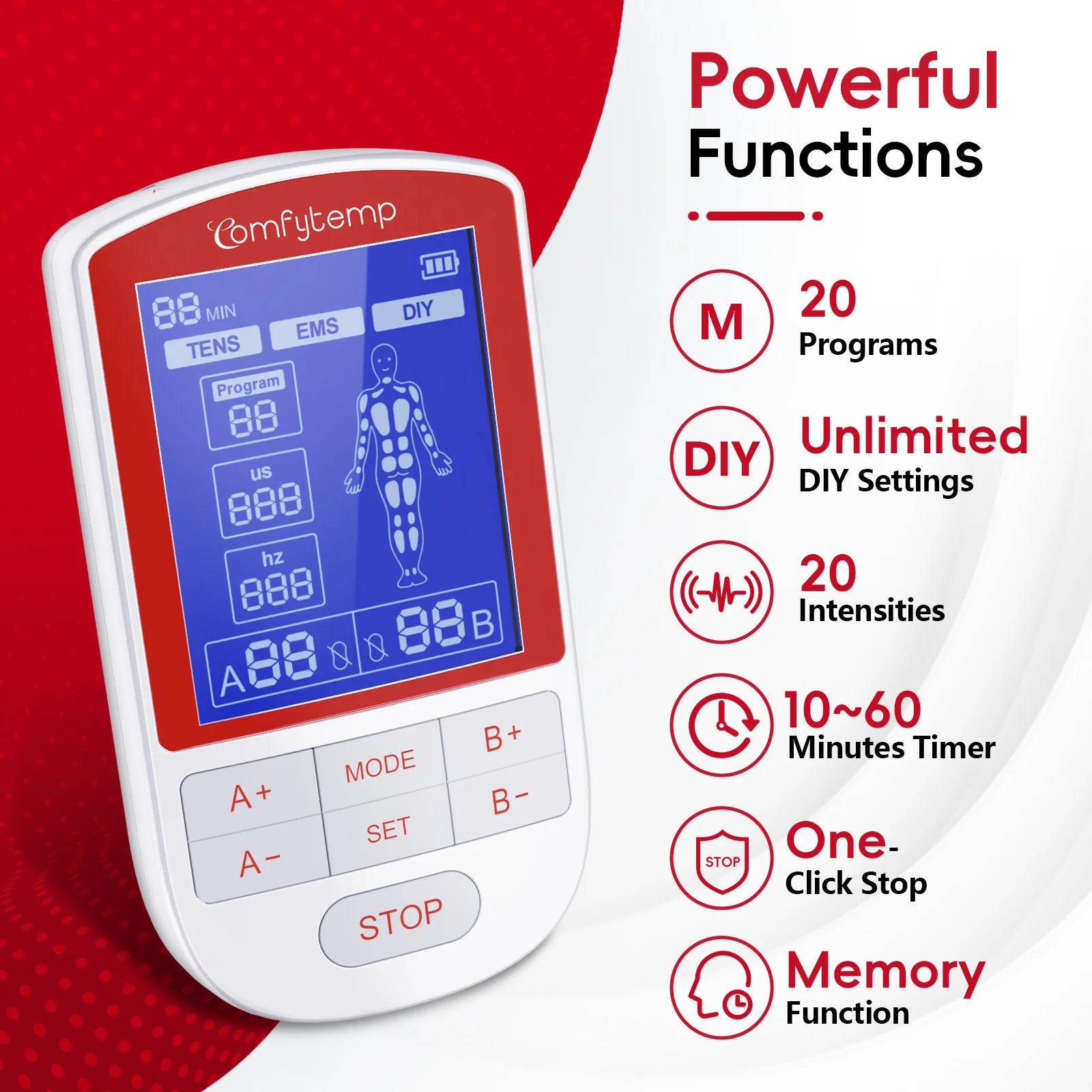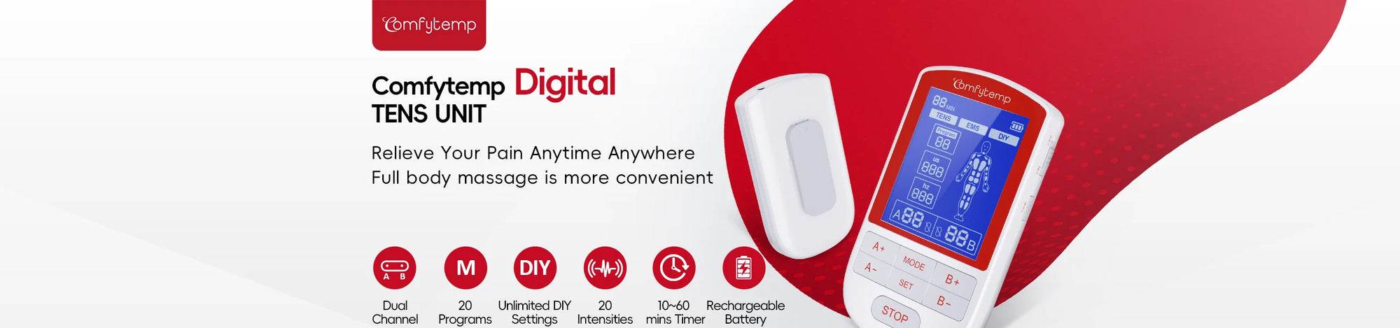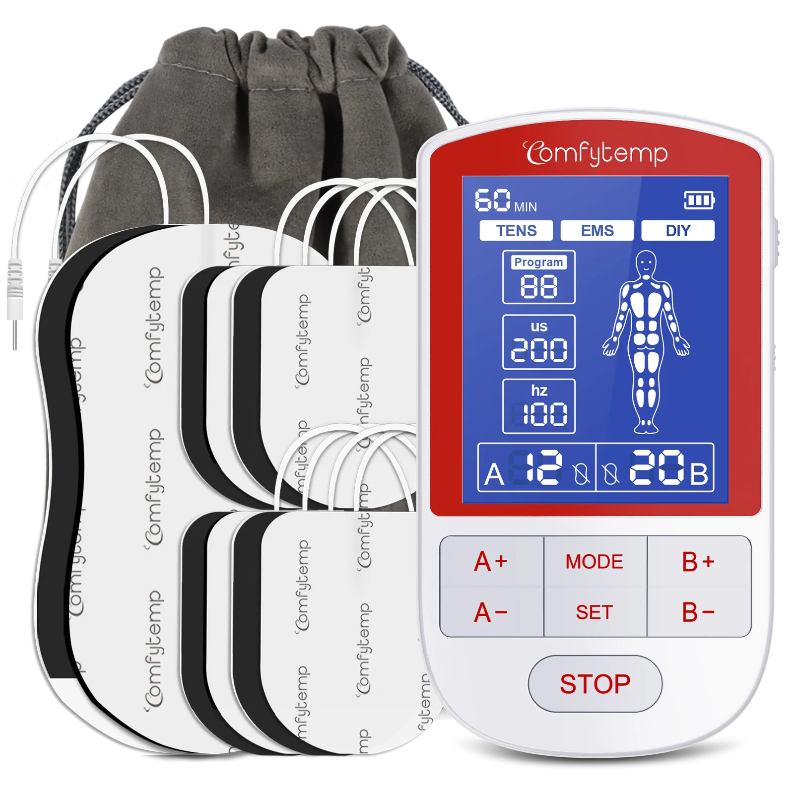 Dual-Channel Control:The TENS machine can treat two areas at once with shared therapy mode but individual intensity control (1-20 per channel). Select from 20 presets or DIY mode for advanced settings, then fine-tune each zone’s strength for targeted relief. Comfytemp Portable Muscle Stimulator is ideal for paired muscle groups or varying pain levels across joints. Time of this electrodes muscle stimulator is adjustable (10-60 minutes) for a personalized, effective treatment experience for you.