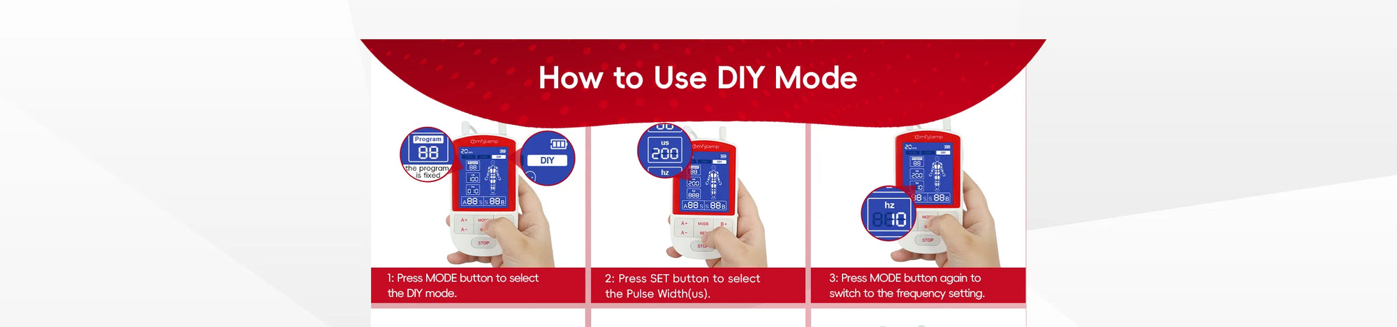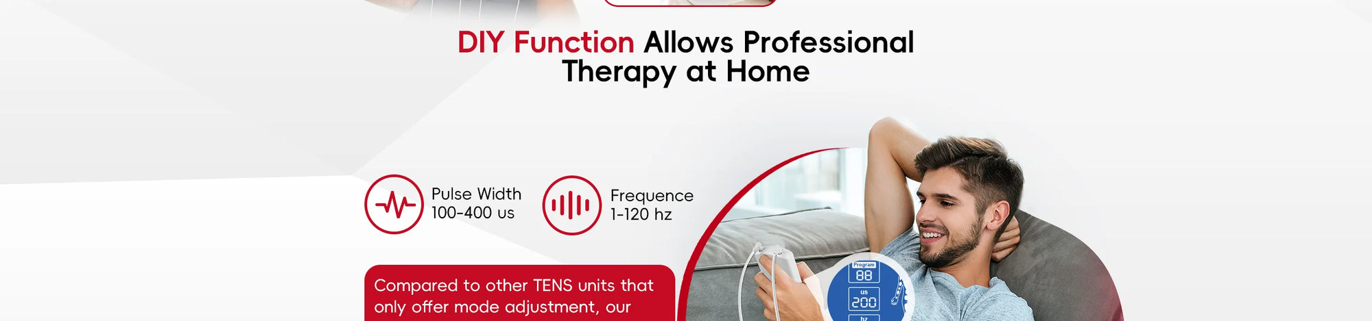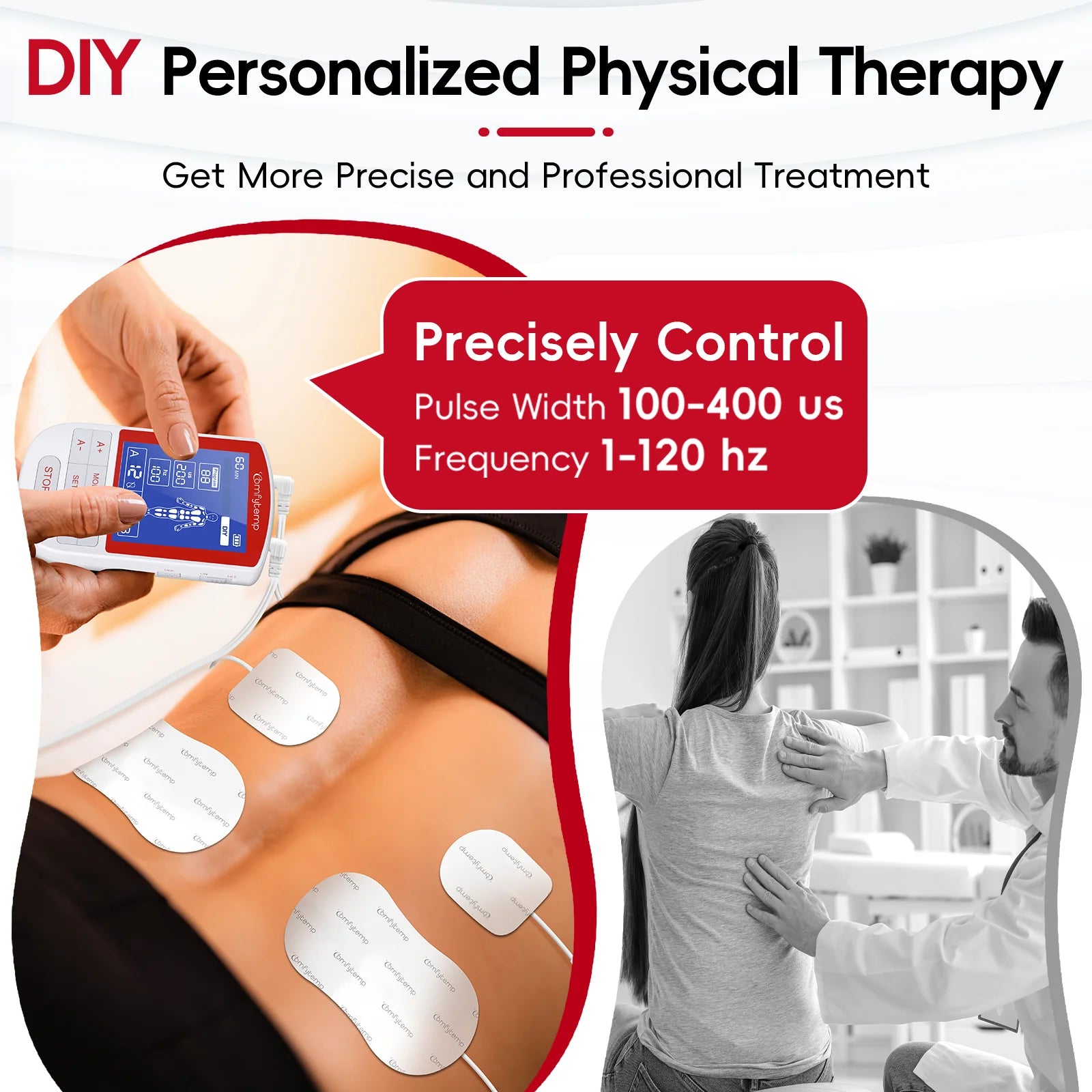 Personalized Customization:DIY Mode of TENS unit muscle stimulator lets you manually set frequency (1-120Hz) and pulse width (100-400μs) to target nerve sensitivity or deep muscle layers. Example settings: Use 10Hz/300μs for sustained back tension, or 30Hz/200μs for mild arm/shoulder discomfort, adapting to your personalized needs. Real-time parameter tracking on-screen ensures safe, gradual adjustments. Ideal for sensitive users or chronic conditions needing gentle, prolonged stimulation.