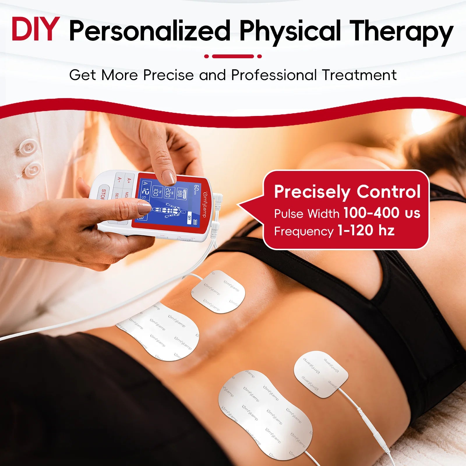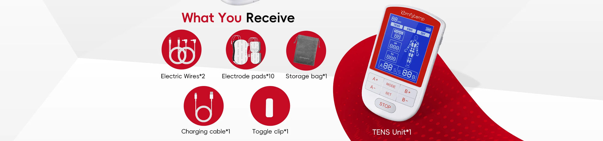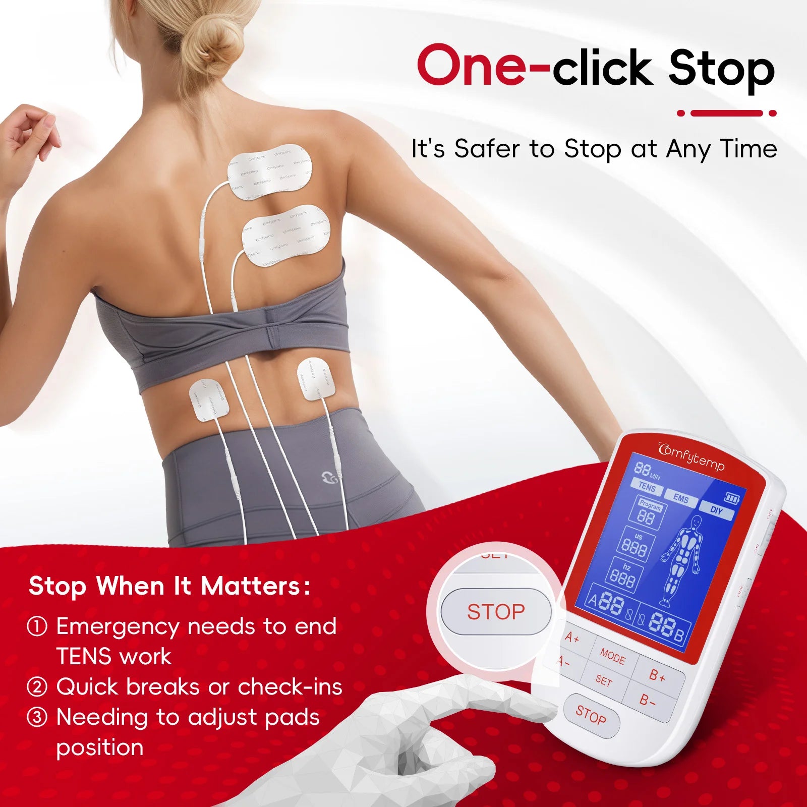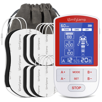 Drug-Free Solution:The Comfytemp TENS unit combines TENS and EMS therapies for versatile, at-home pain management. Designed to deliver targeted, long-lasting relief without medication, This TENS machine addresses back pain, period cramps, arthritis, carpal tunnel, tennis elbow, and discomfort in shoulders, knees, legs, or feet. The muscle stimulator' TENS mode manage back/neck pain during office work, EMS ease acute knee stiffness after hiking, or reduce gym soreness at weekend.