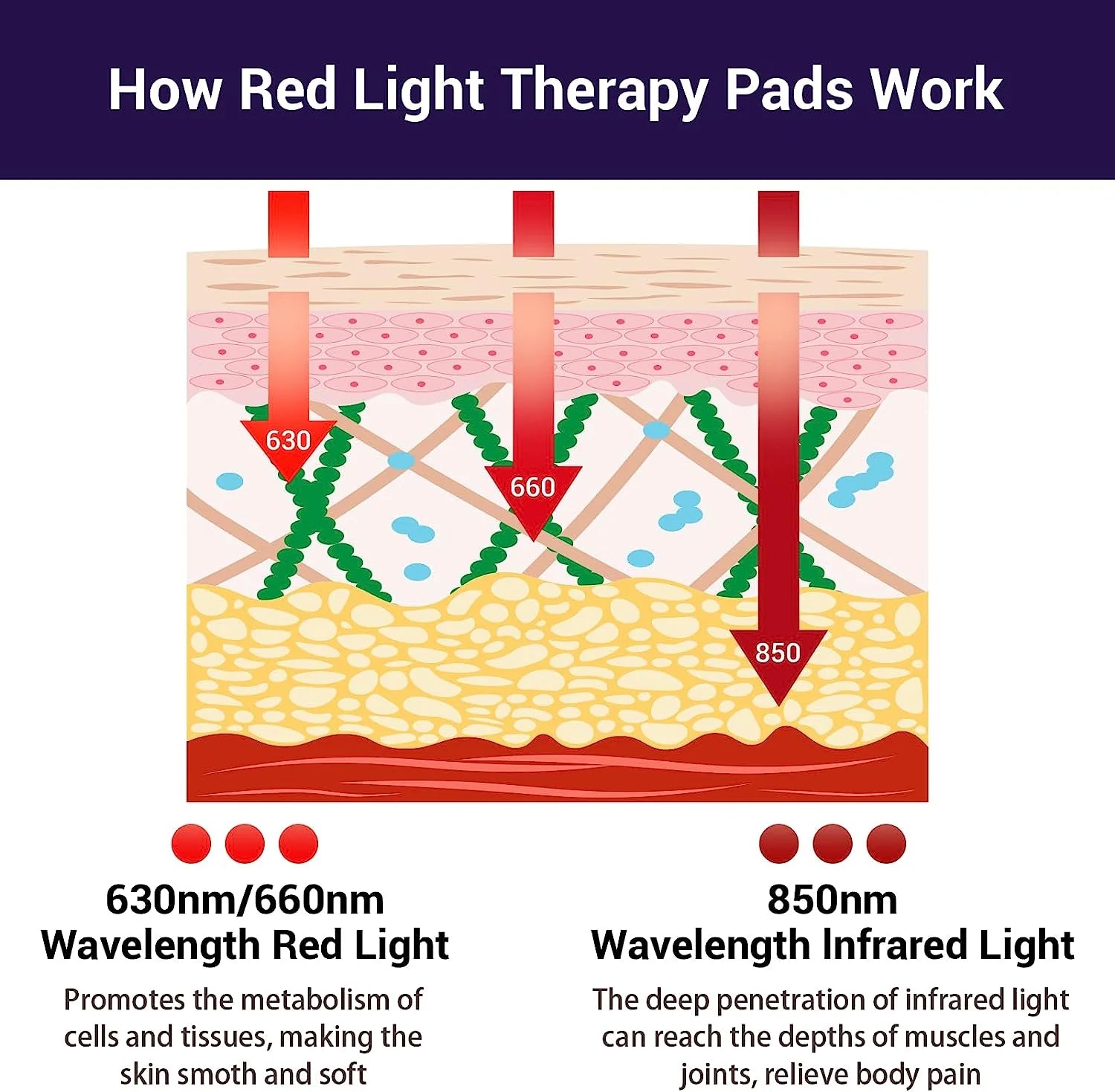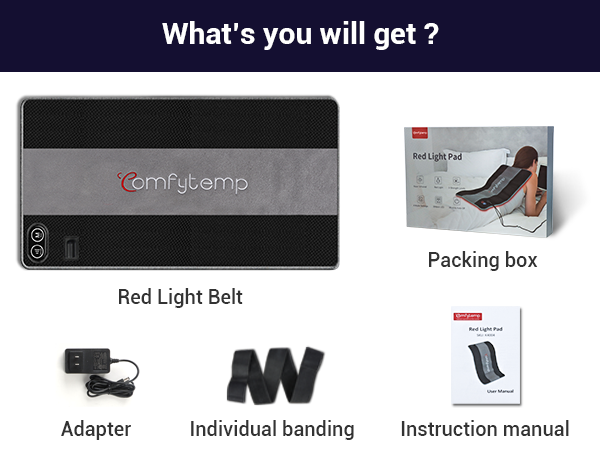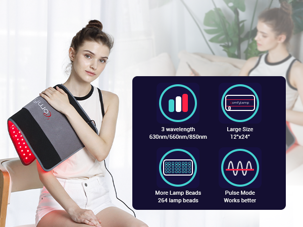 Comfytemp infrared light therapy wrap provide 3 wavelengths each is 630 nm red light, 660 nm red light and 850 nm infrared light, 630 nm 660 nm red light act on skin epidermal layer of cells to promote cell metabolism, speed up wound healing and skin repair. 850 nm infrared light to help body joint muscle pain relief, reduce inflammation and restore body energy, powerful 3 chip technology with more powerful energy.