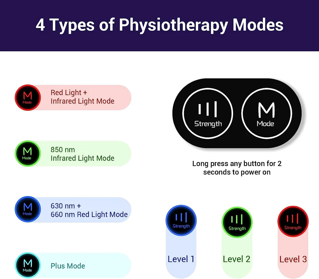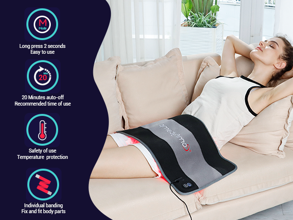 The Comfytemp infrared light therapy device for the body offers 4 modes and 3 strengths, allowing for 12 different usage combinations. The red light mode speeds up wound healing, the infrared light mode relieves pain, the combination mode (red + IR) addresses both. The pulse mode provides a more potent analgesic effect, weight loss and promoting new cell growth. Our red light therapy belt includes a 20-minute auto-off timer, ensuring both effectiveness and user safety.